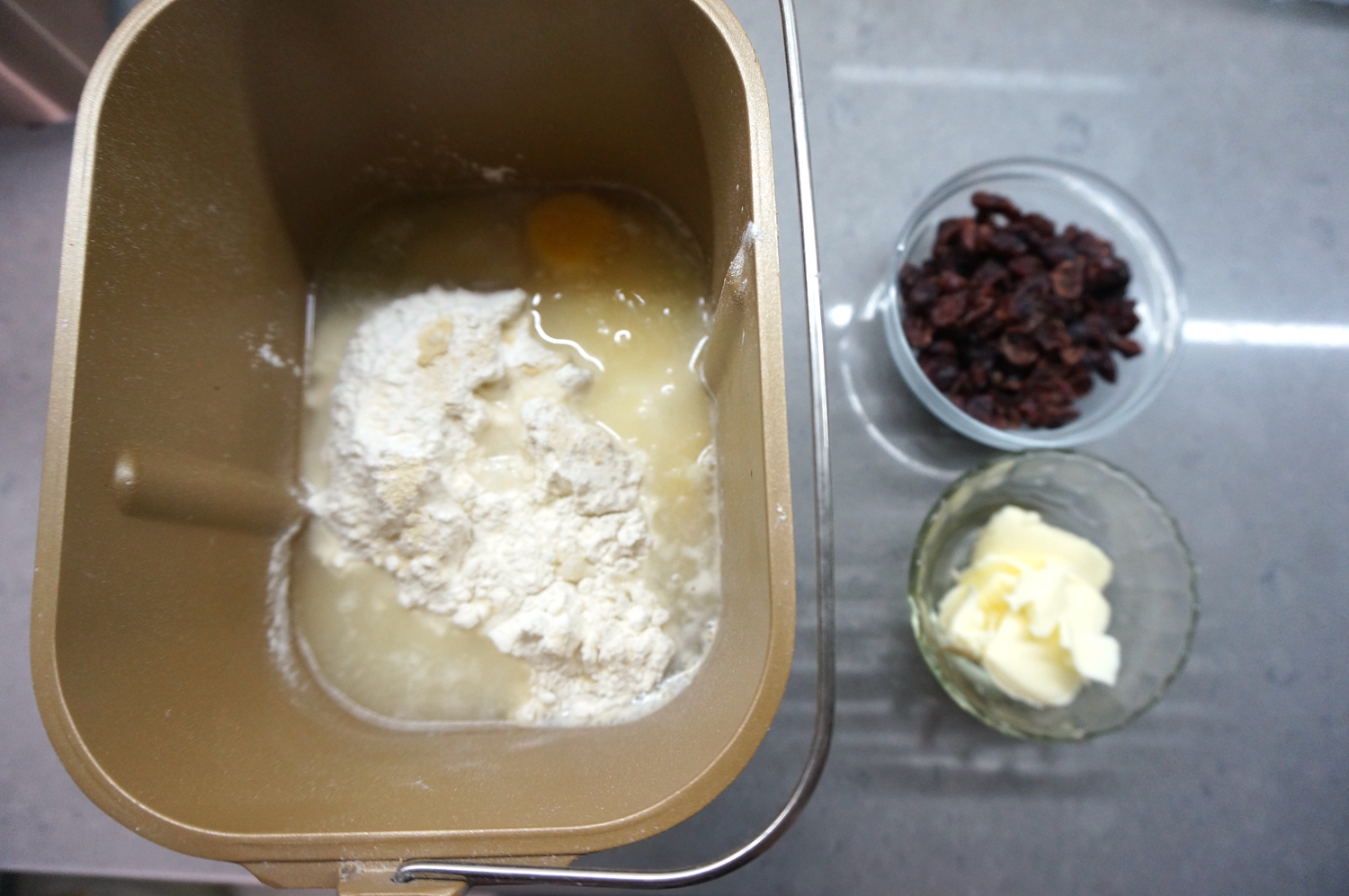 材料:高筋面粉300克,酵母3克,鸡蛋50克,清水170-180克,白糖30克,盐1克,黄油30克,蔓越莓干80克