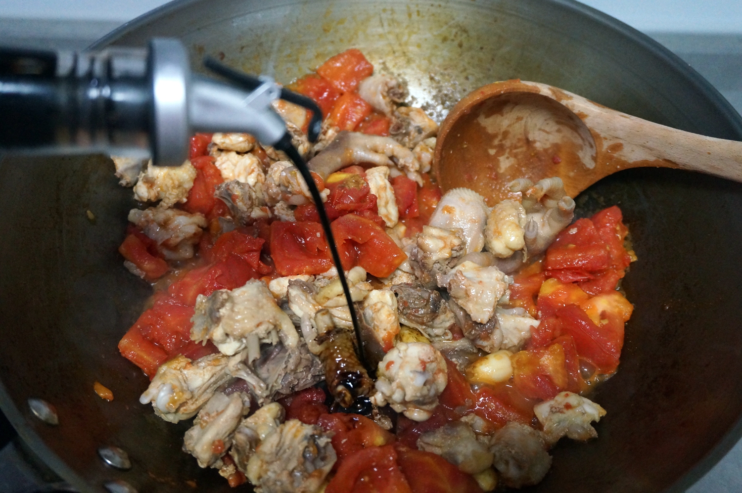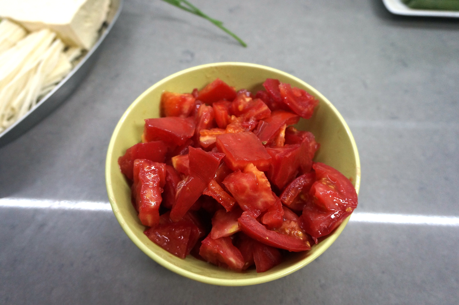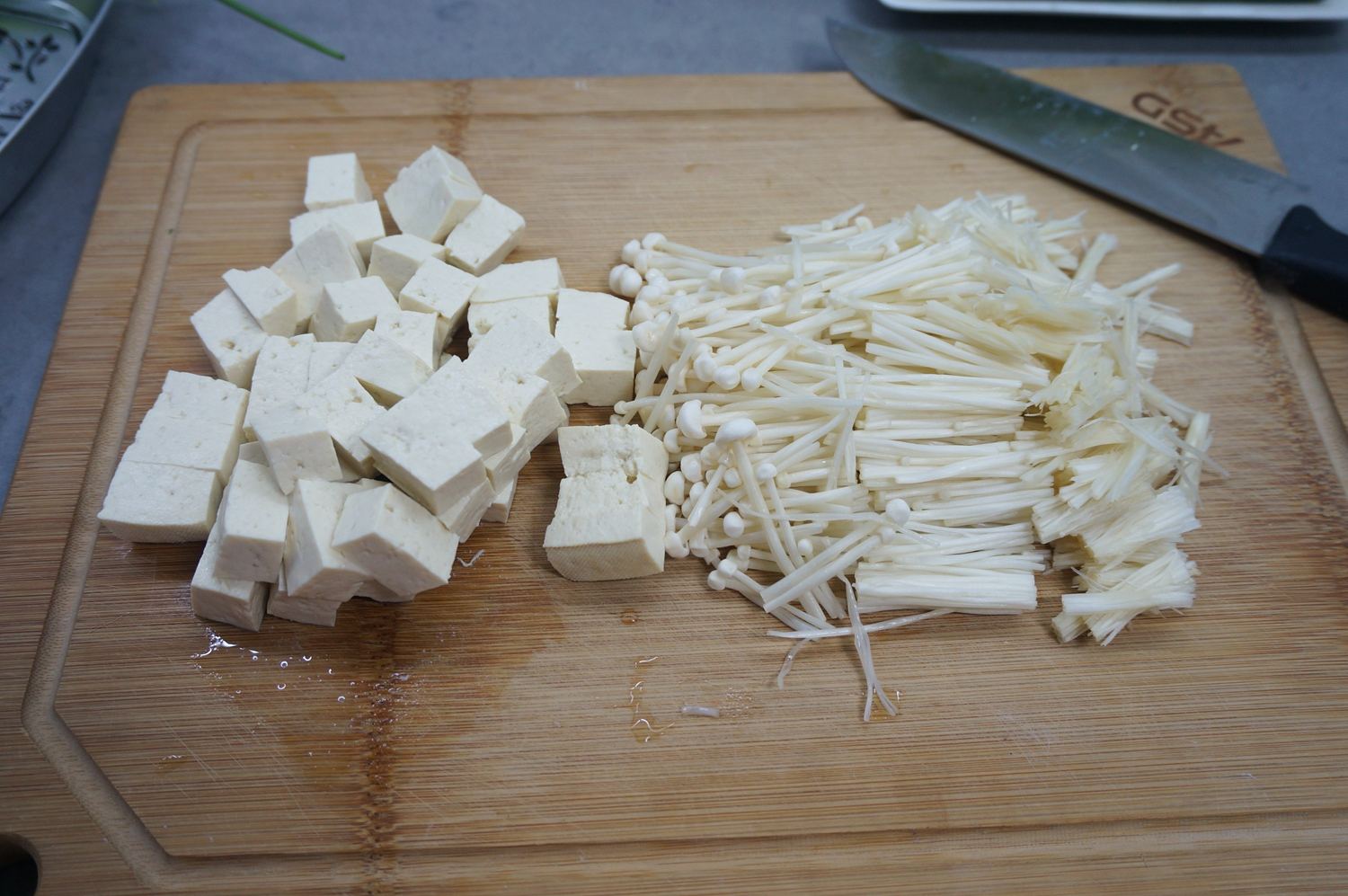 材料:1斤多重小鸡1只,西红柿2个,豆腐1块,金针菇1把,油少许,大蒜1头,生抽少许,酱油少许,盐适量,香葱少许