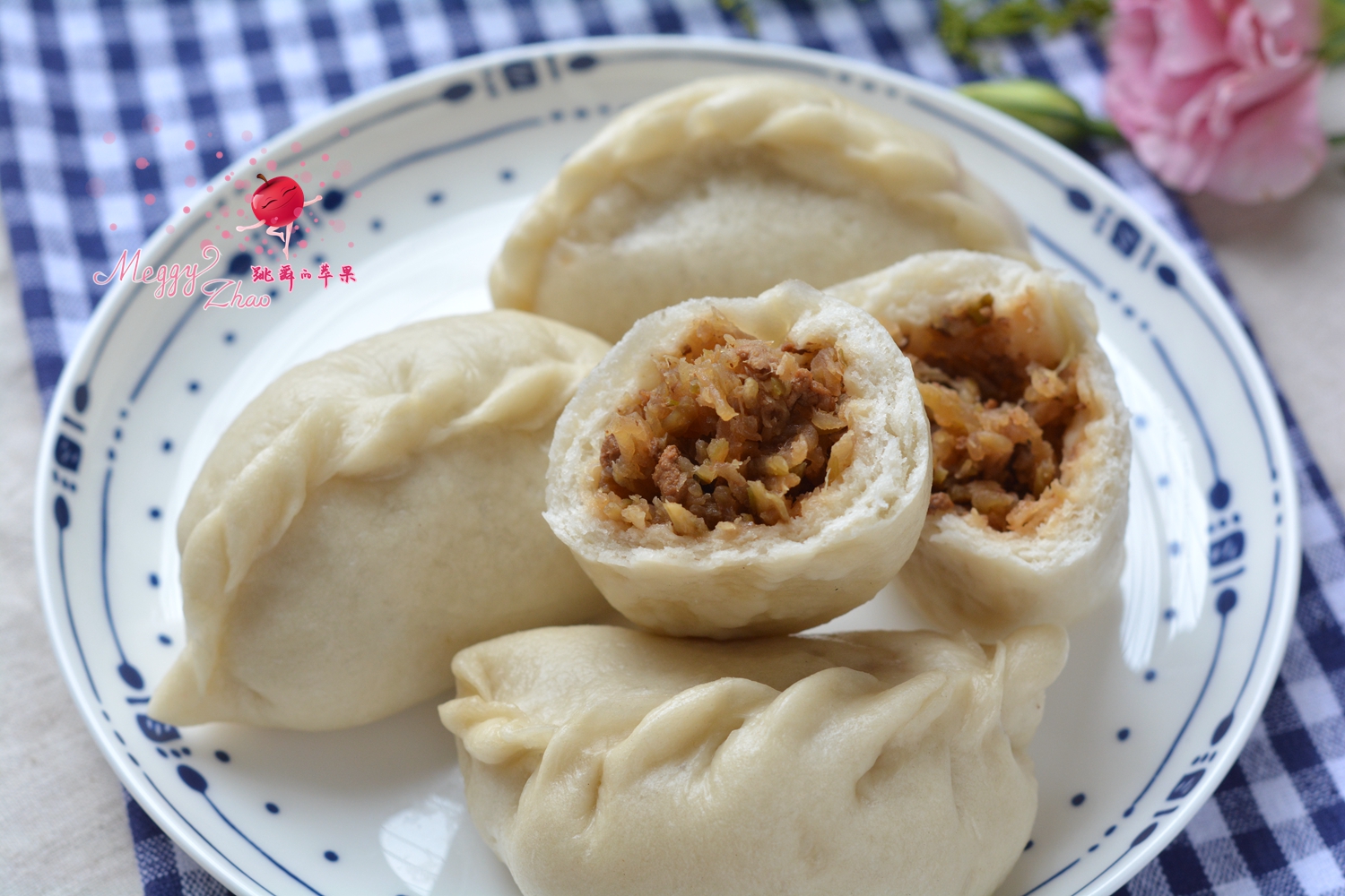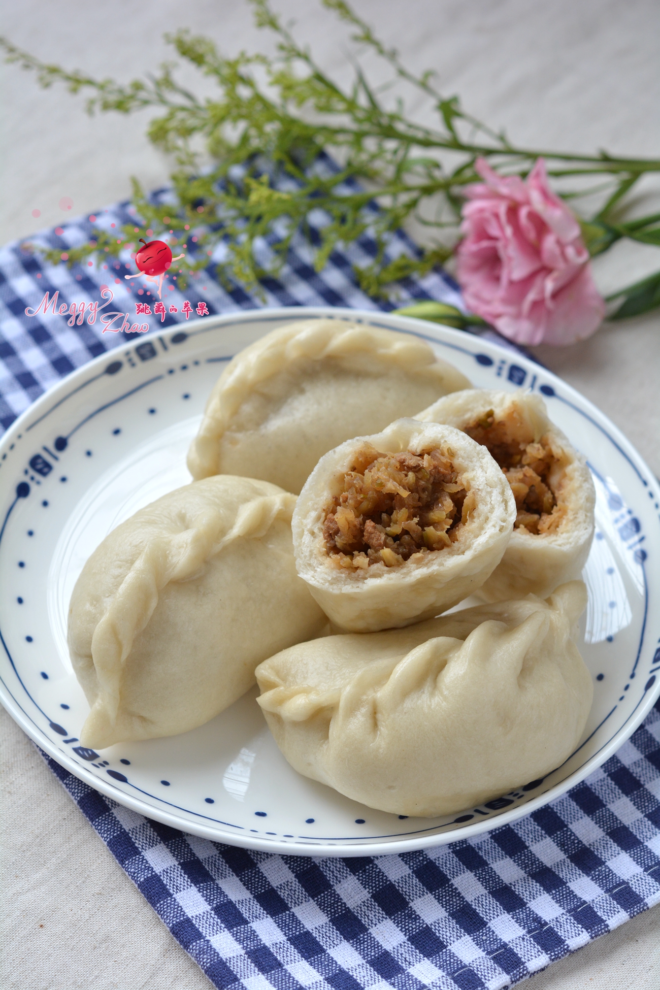 材料:萝卜、猪肉馅、油、葱花、酱油、盐、面粉、酵母、凉水