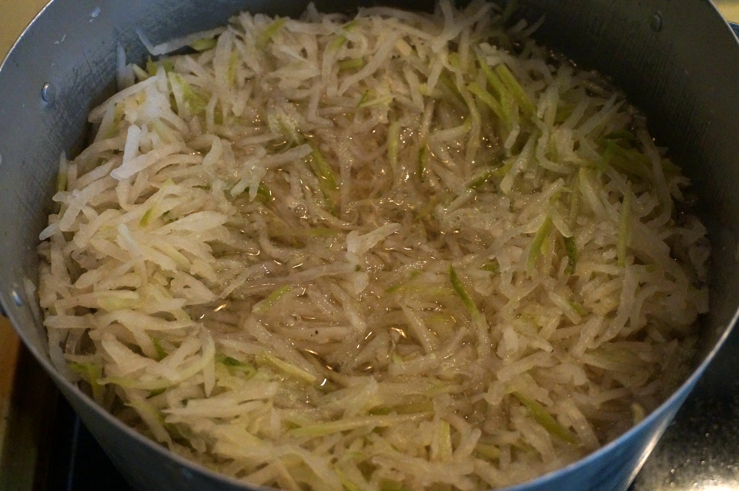 6. 将萝卜倒入锅中,充分混合均匀,这个馅可以直接吃,倍儿香;