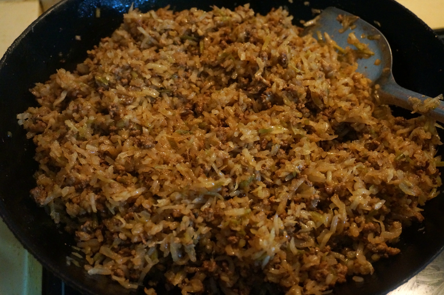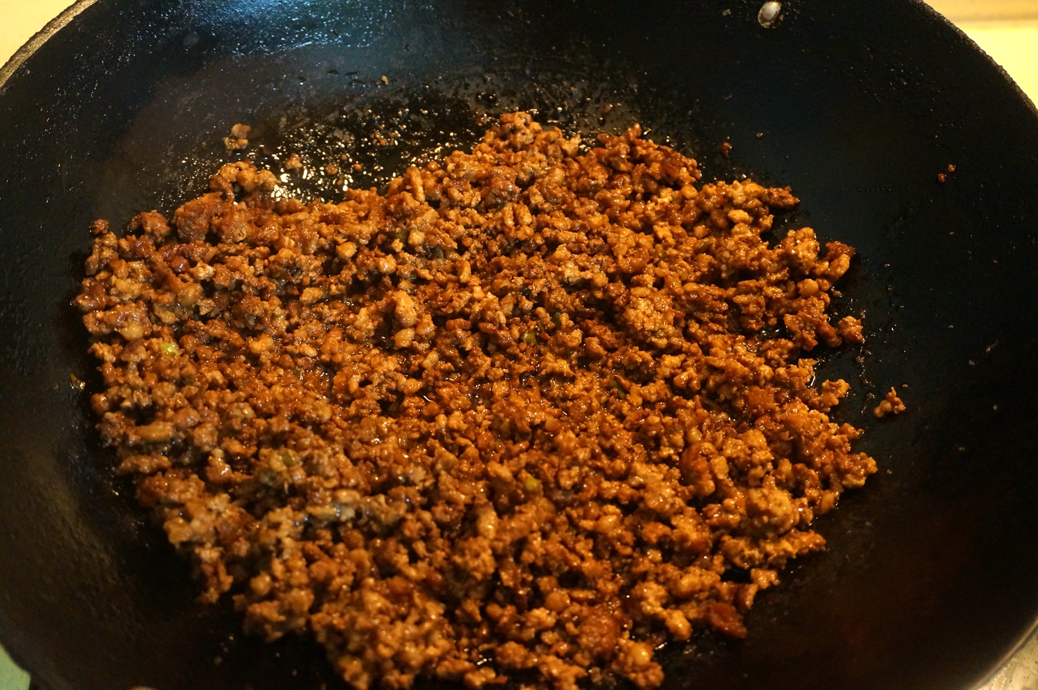 5. 炒锅中倒油,将葱花煸炒出香味,略微有点焦黄;将肉馅入锅中,煸炒变色,加入适量的酱油、盐,调色调味;