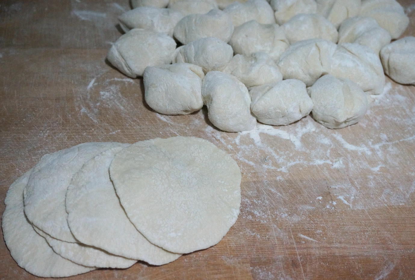8. 面团取出放在案板上,搓成长条,切成大小均匀的剂子,擀成厚一点的圆皮;