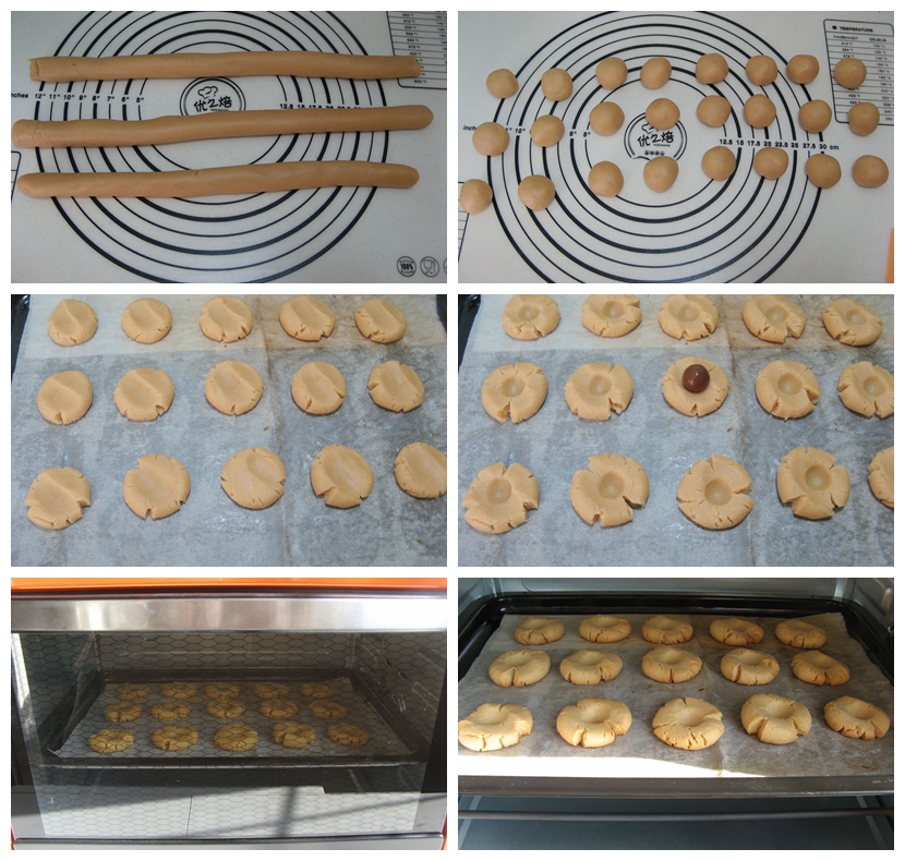 12、烤盘中铺好油纸,将小圆剂子按扁成小饼;