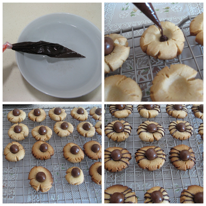 23、在麦丽素上面点缀上眼球,待晾干后,再点缀上黑巧克力融液做为黑眼珠。