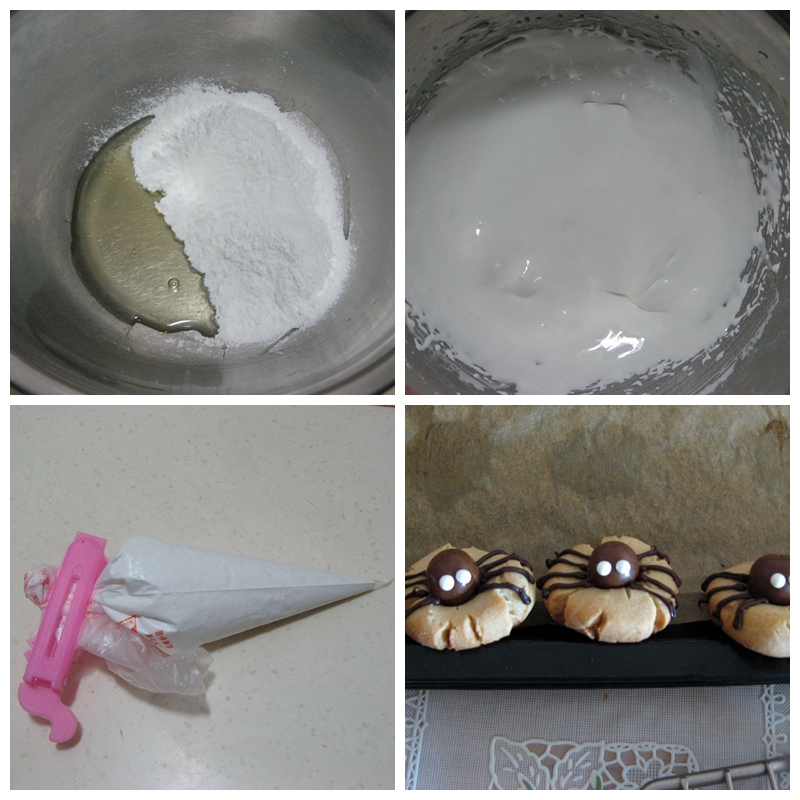 2、因为此处用的糖霜的比例较小,所以如果不做糖霜饼干的话,可以将打发的糖霜换成白巧克力当眼球装饰,或者直接从店里购买白眼球成品;