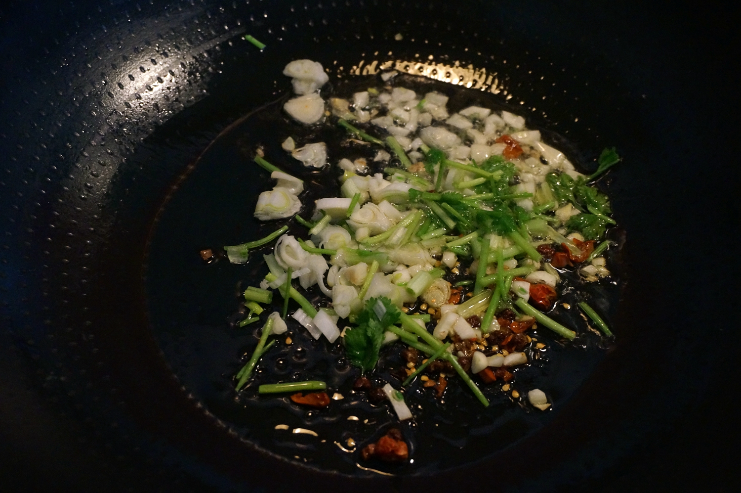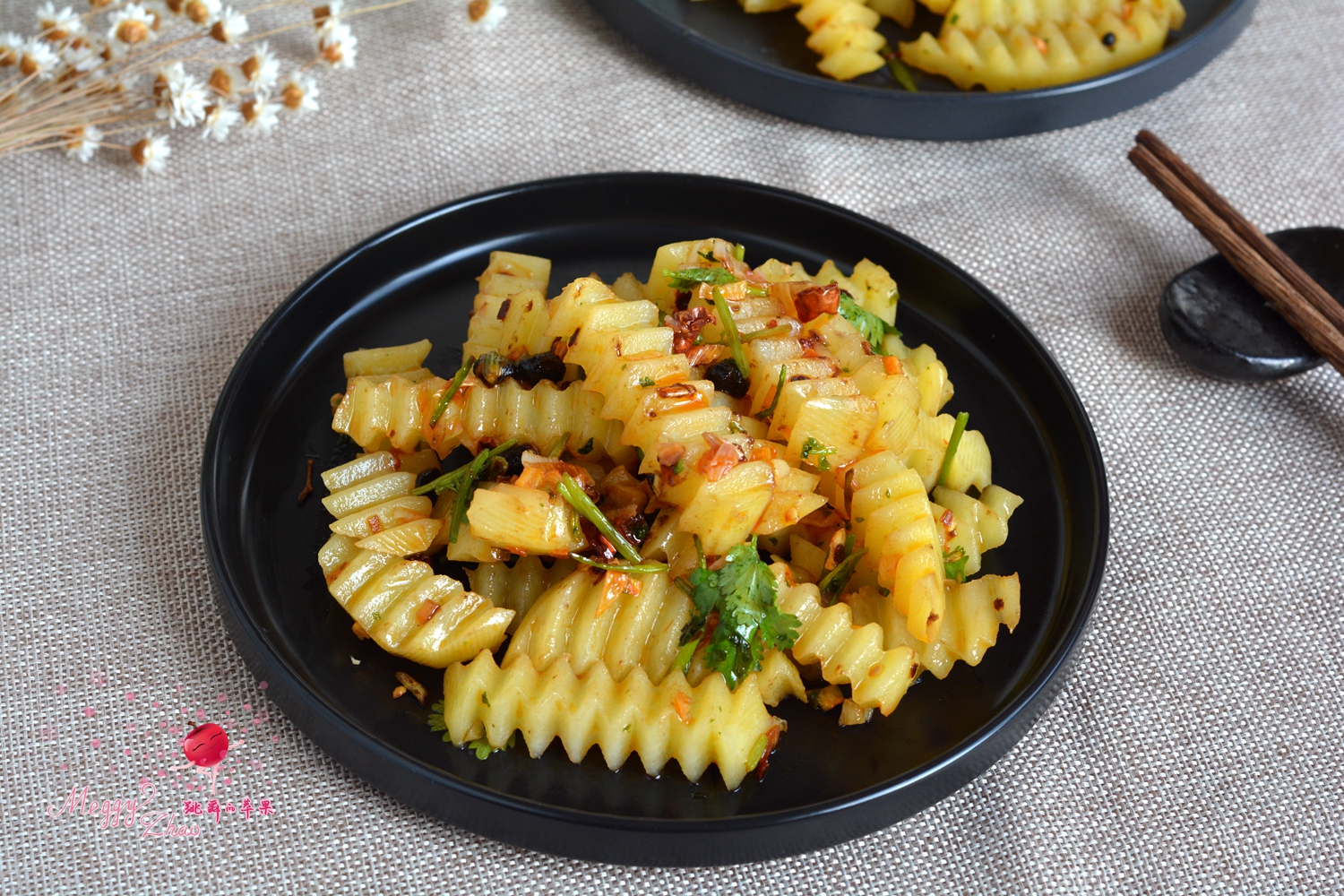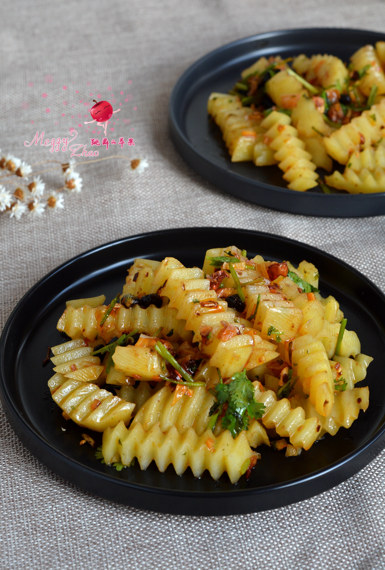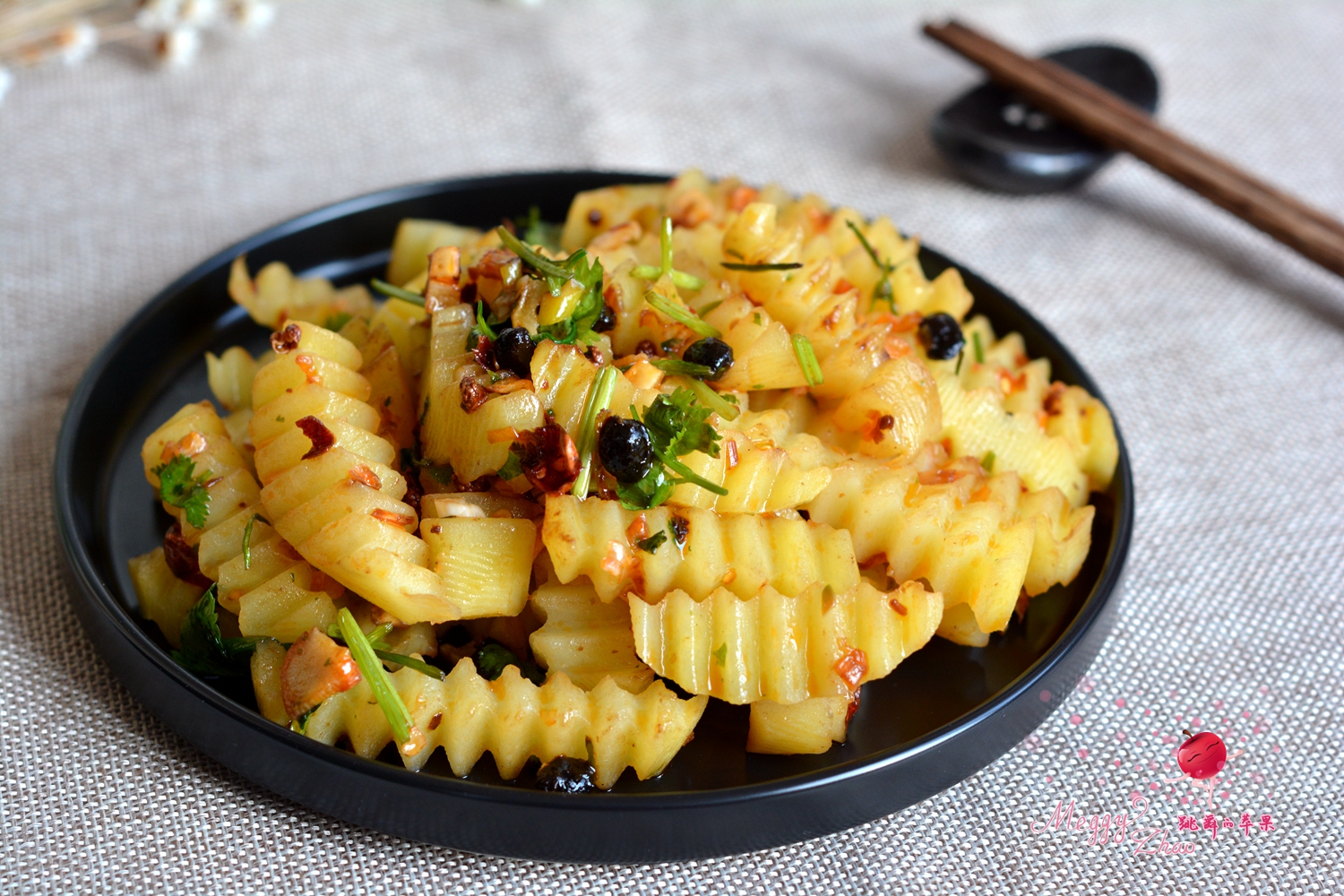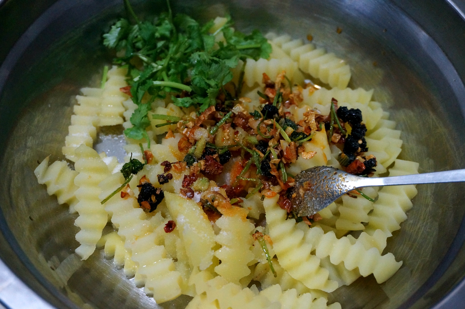 材料:土豆两个,香菜两棵,干红辣椒3个,花椒一小撮,大蒜数瓣,大葱一小段,植物油少许,盐适量,辣豆豉一勺