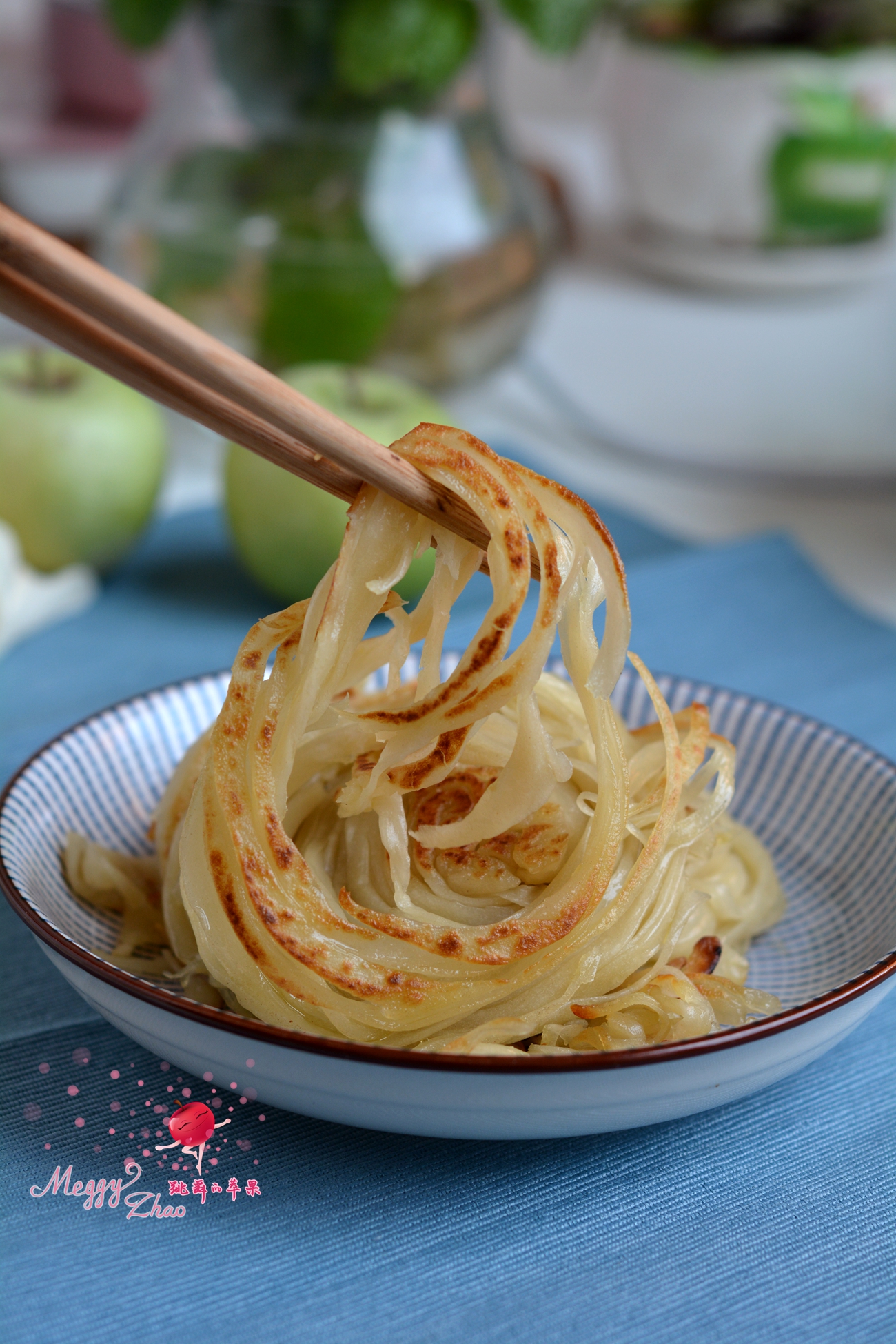 2. 你肯定要问用面条成不成?答:不成噢。因为面条的含水量太少,面皮硬,烙出来的饼除非是多油才会酥脆;没有网纹刀,用普通刀将面皮拉成一条条状也可以;