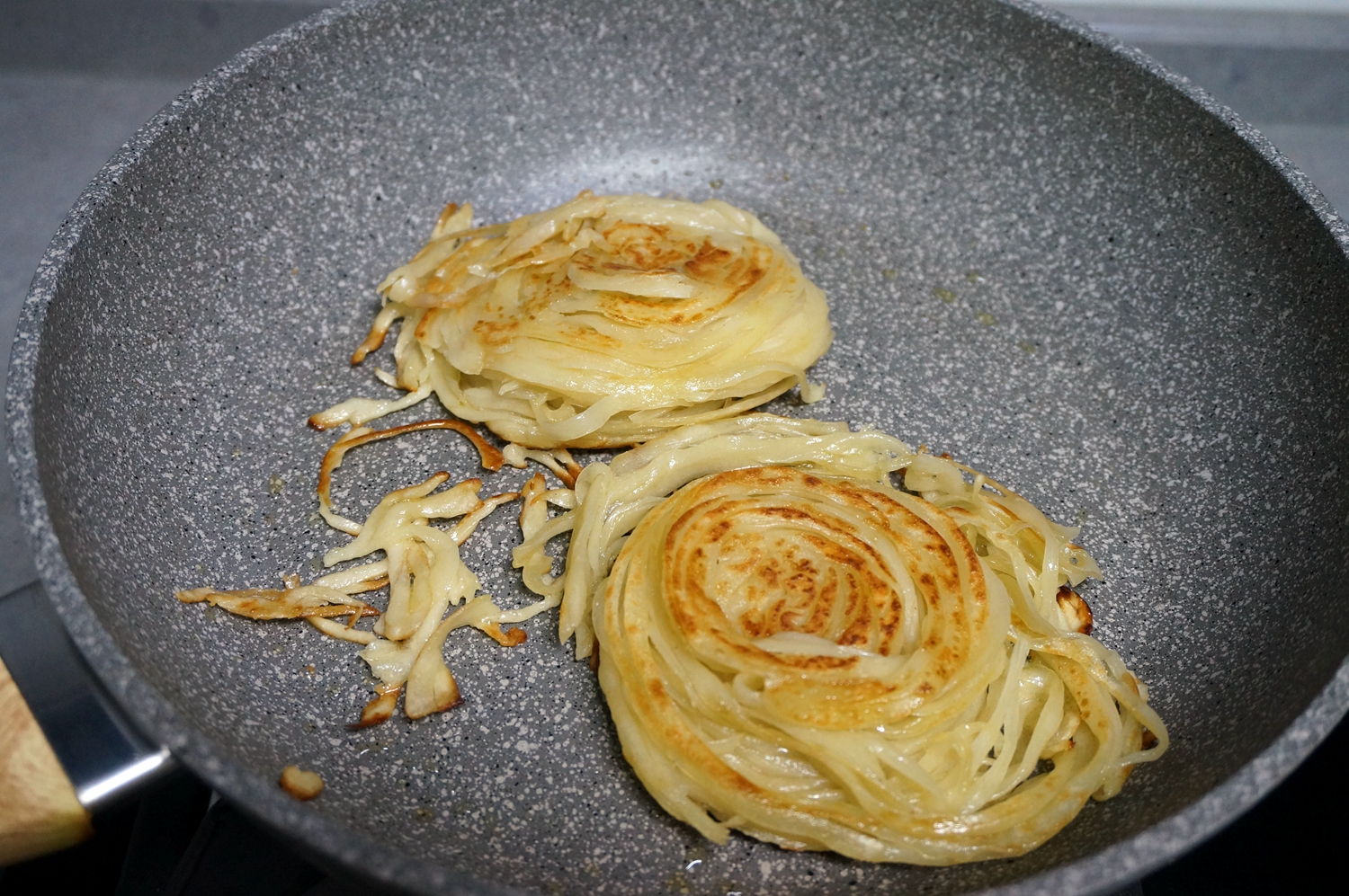 14. 直到两面金黄,轻轻一碰,饼丝自然散开,中间厚,一定要小火煎透,另外,烙的时候可以根据饼的情况和自己喜欢的口感再倒适量油,油多,饼丝酥脆而内部柔软,如果油少,就会糊底;可以盖盖子焖一会儿,促进内部成熟。出锅后用筷子挑散,趁热吃。