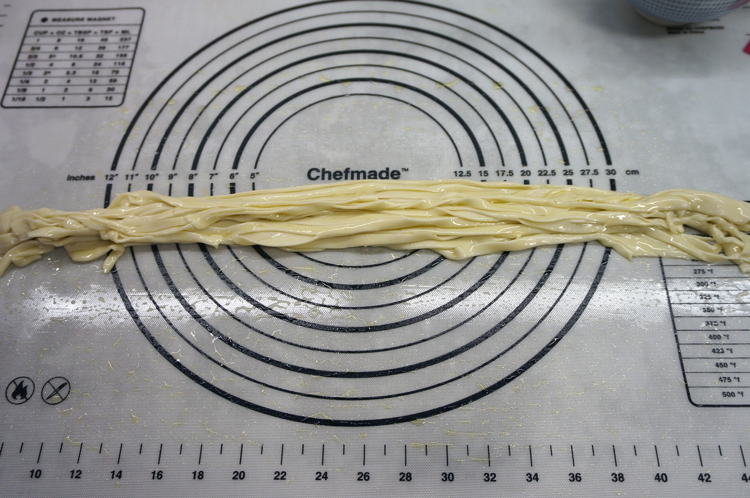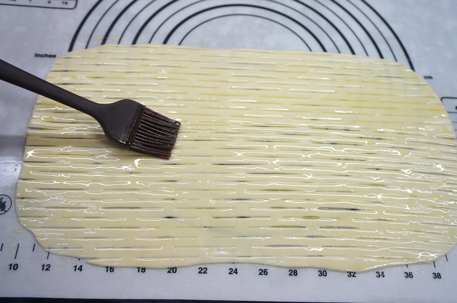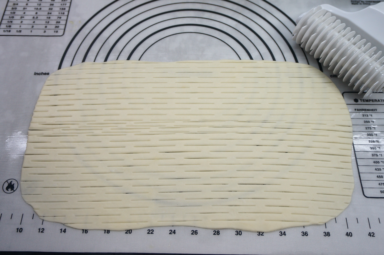 7. 用做面包的网纹刀在上面走两下,面皮就被均匀地拉出花刀来;没有这个刀也没事,用普通刀或者披萨刀拉成面条状,注意别把揉面垫划破;