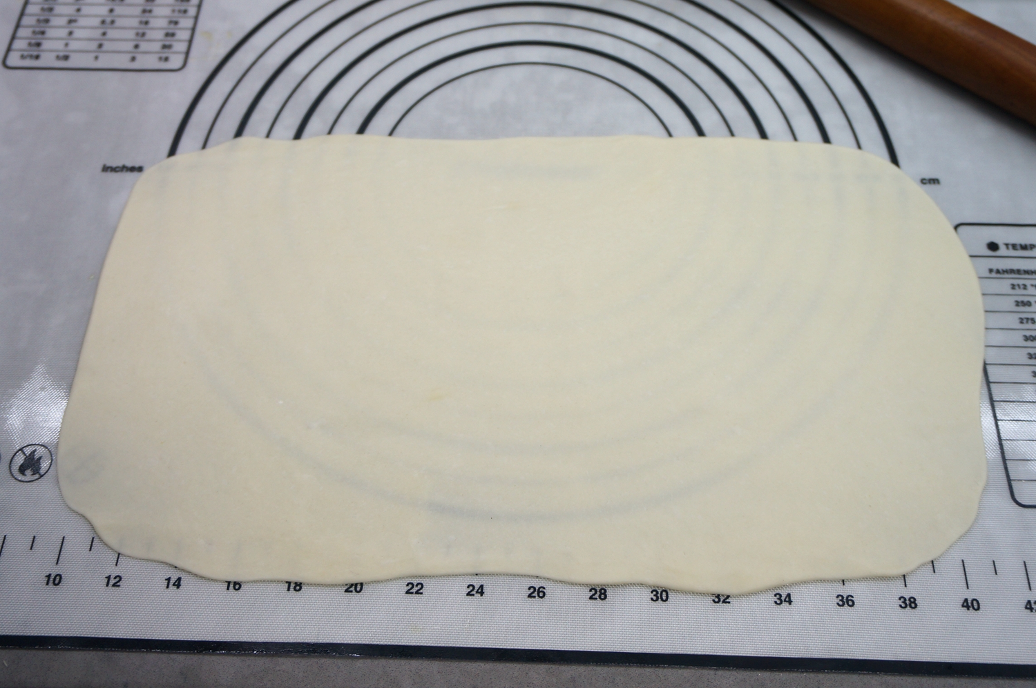 6. 擀成薄薄的长方形,有1毫米那么薄;面团饧得好,想擀成什么样就是什么样,而且不回缩;