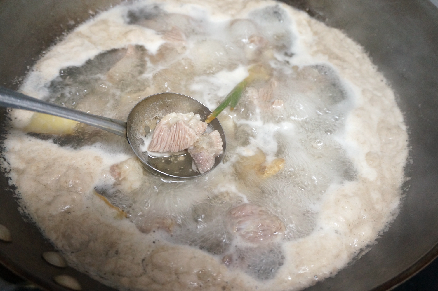 3. 入温水锅中焯一下,从滚开的地方捞出,可以避免浮沫沾上面;