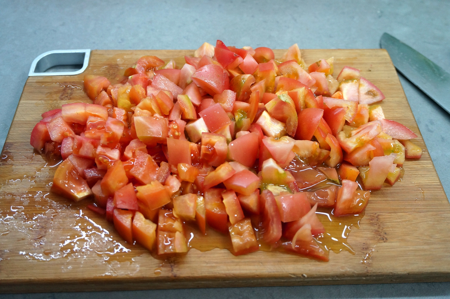 5. 切成小丁;挑选西红柿尽量要肉熟汁多的,味道浓浓的才好吃;