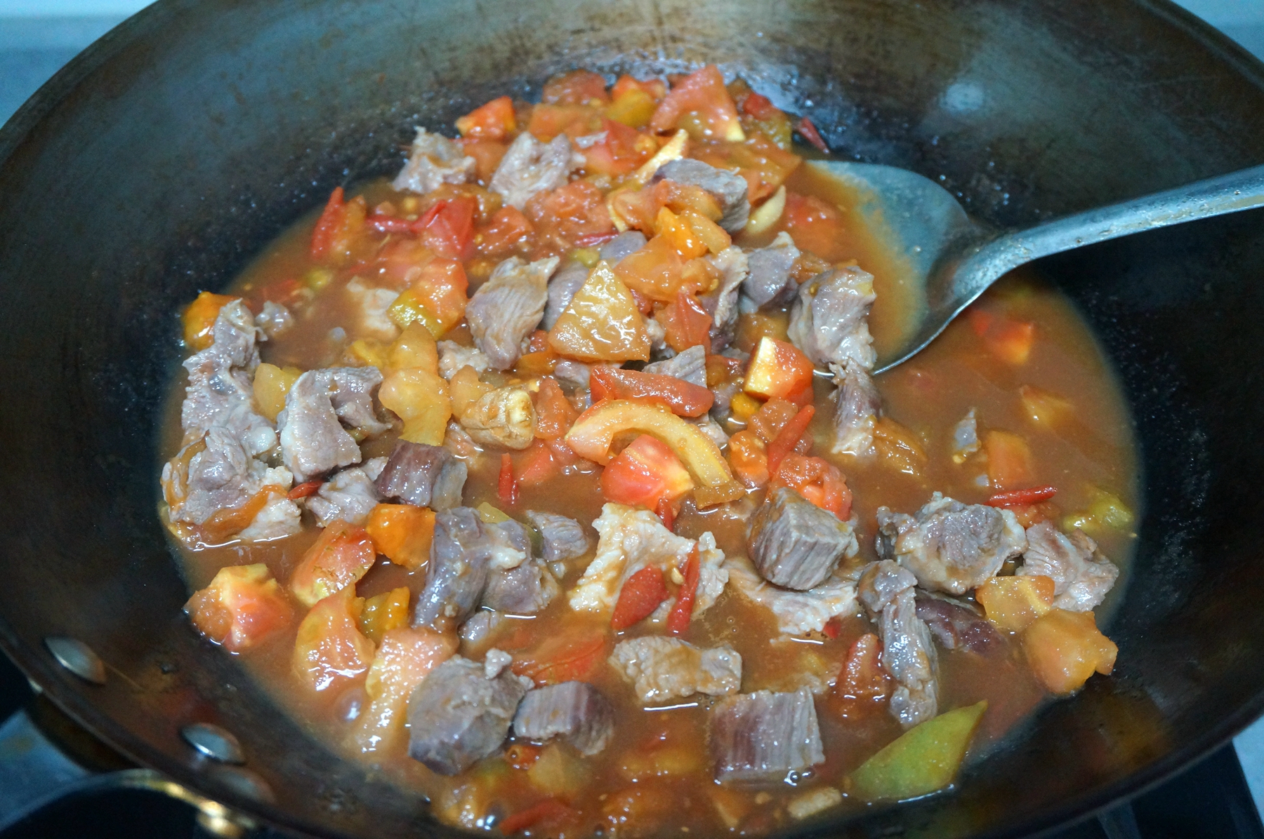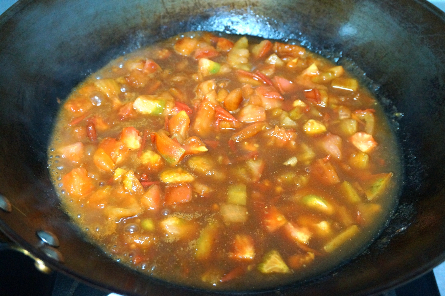 6. 炒锅中倒少许油,将西红柿倒入锅里翻炒出汤,再倒少许酱油调色,加适量水煮开;