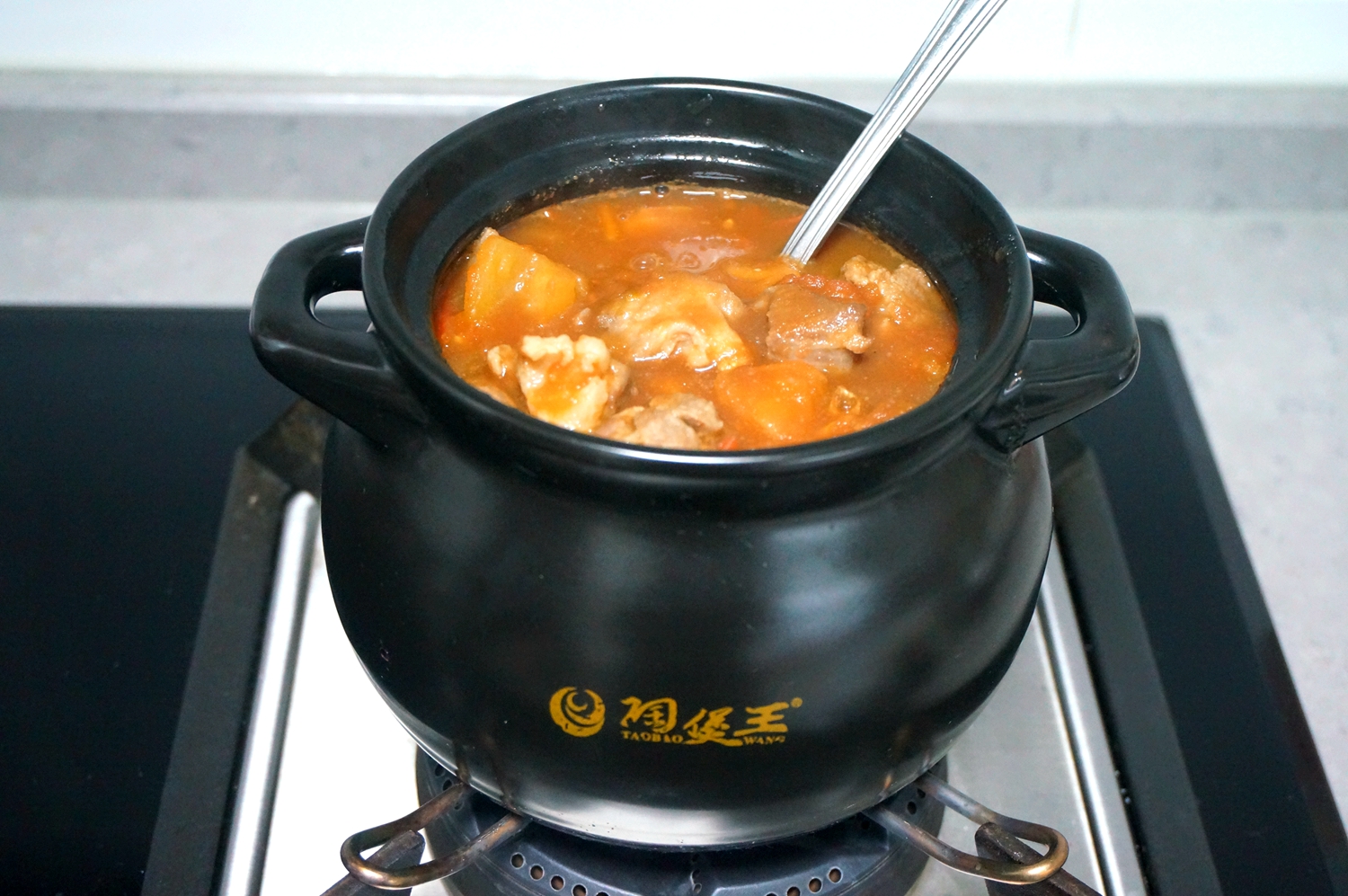 8. 倒西红柿牛肉汤倒入小砂锅中,尽量选择大一点儿的砂锅,这样能盖上盖子,密封效果好,我这个装得有些满,所以可以留一些汤汁在锅里,待锅里的蒸发掉一些,可再续进来,这样就不会浪费了;