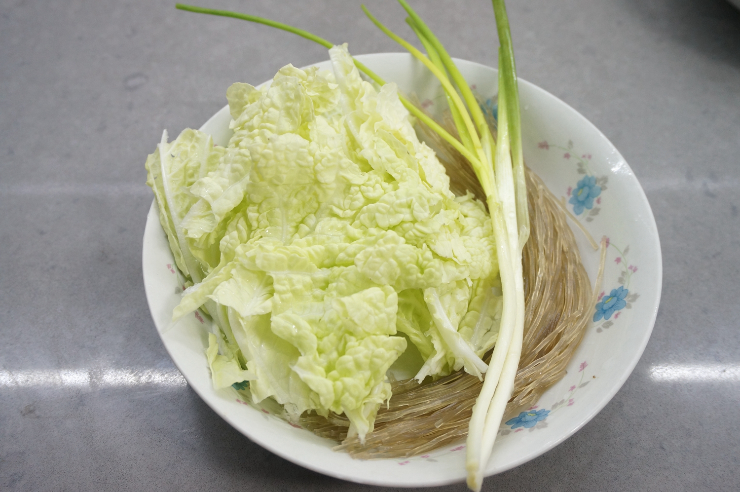 9. 提前把白菜叶、香葱清洗干净,粉条用温水泡软;