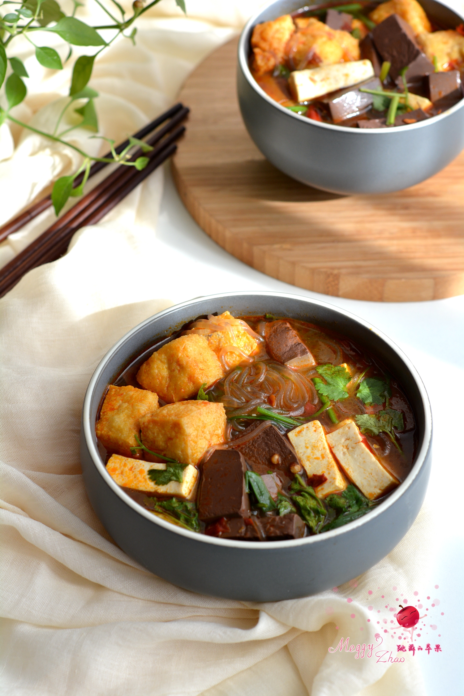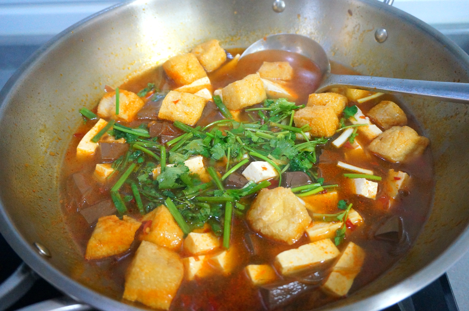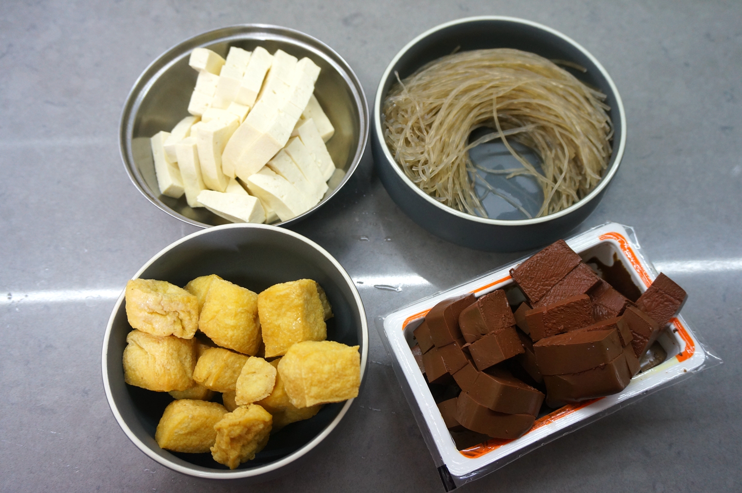 材料:鸭血一盒,北豆腐一块,红薯粉条一碗,油豆腐一碗,豆瓣酱一大勺,香菜两棵,香葱大棵,油少许