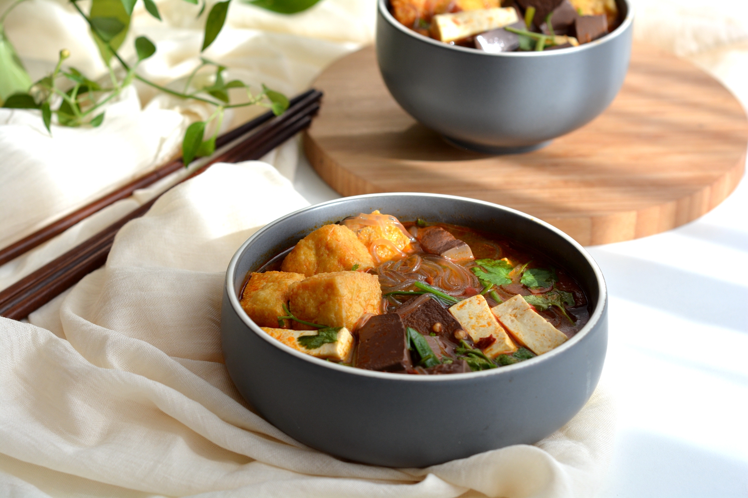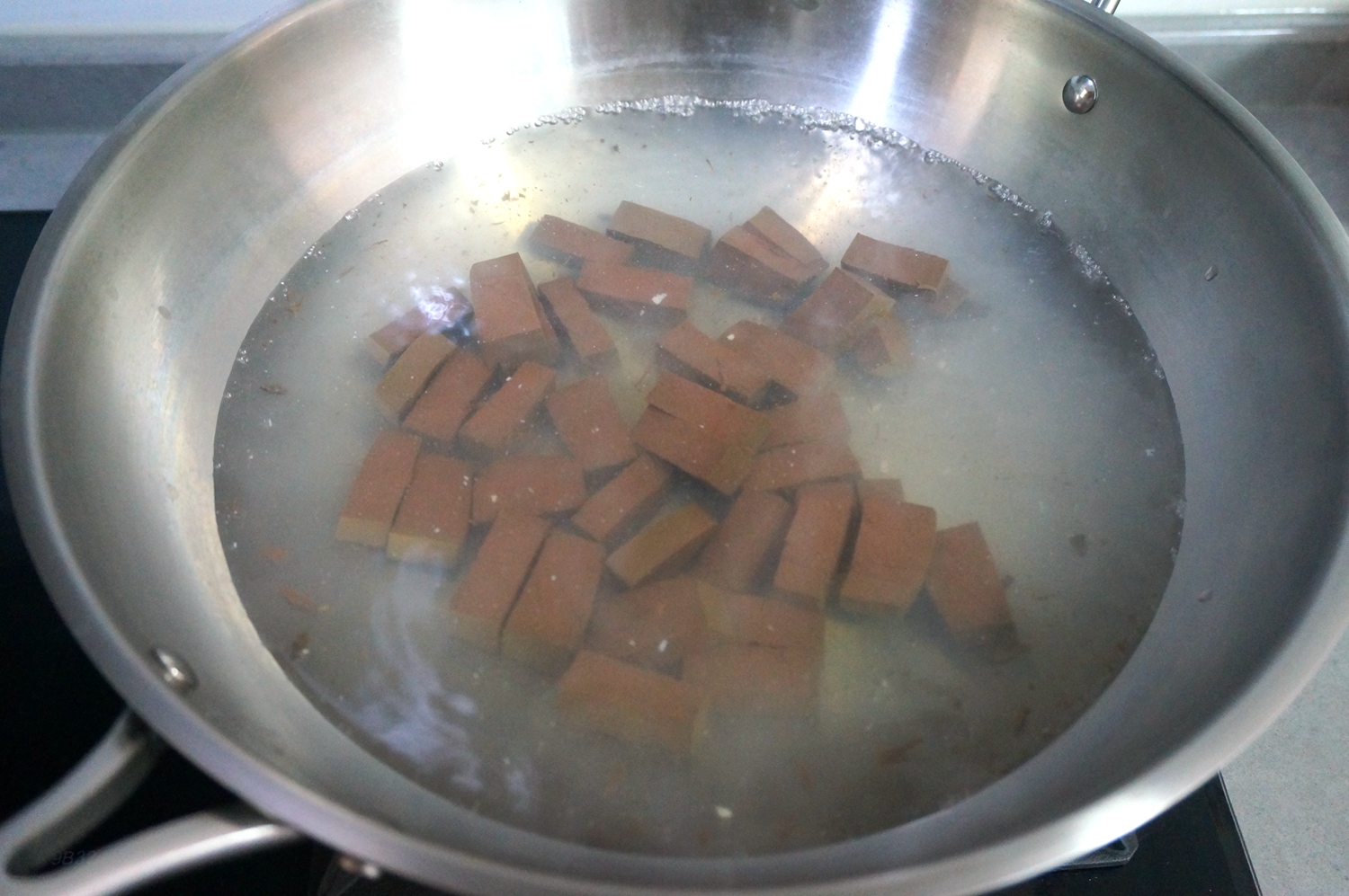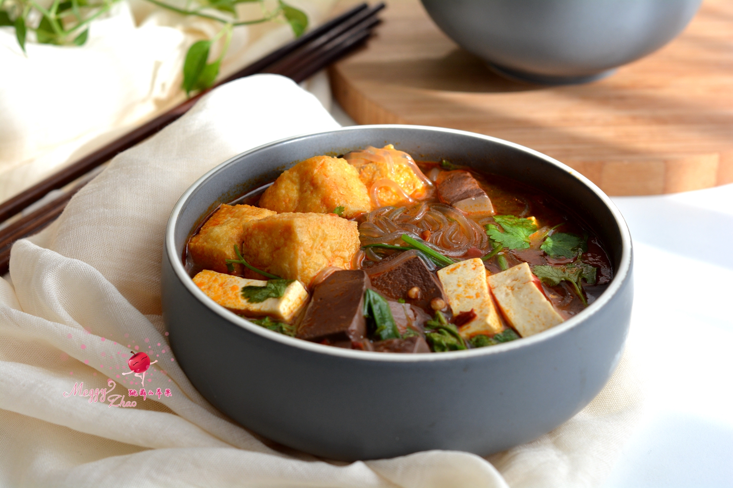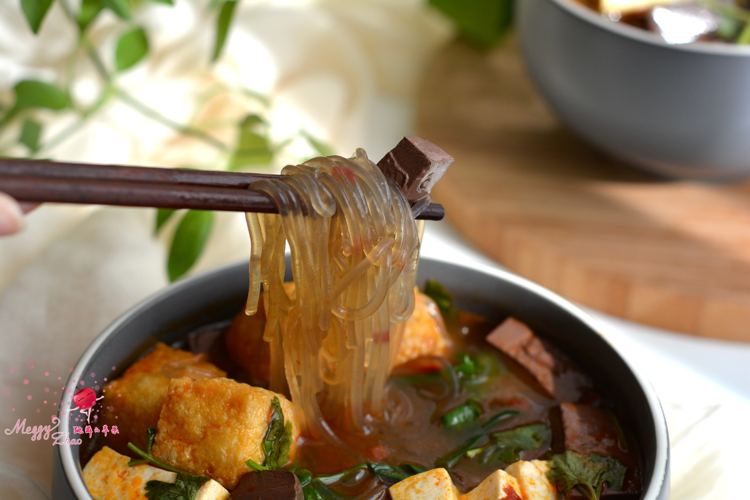 材料:鸭血一盒,北豆腐一块,红薯粉条一碗,油豆腐一碗,豆瓣酱一大勺,香菜两棵,香葱大棵,油少许