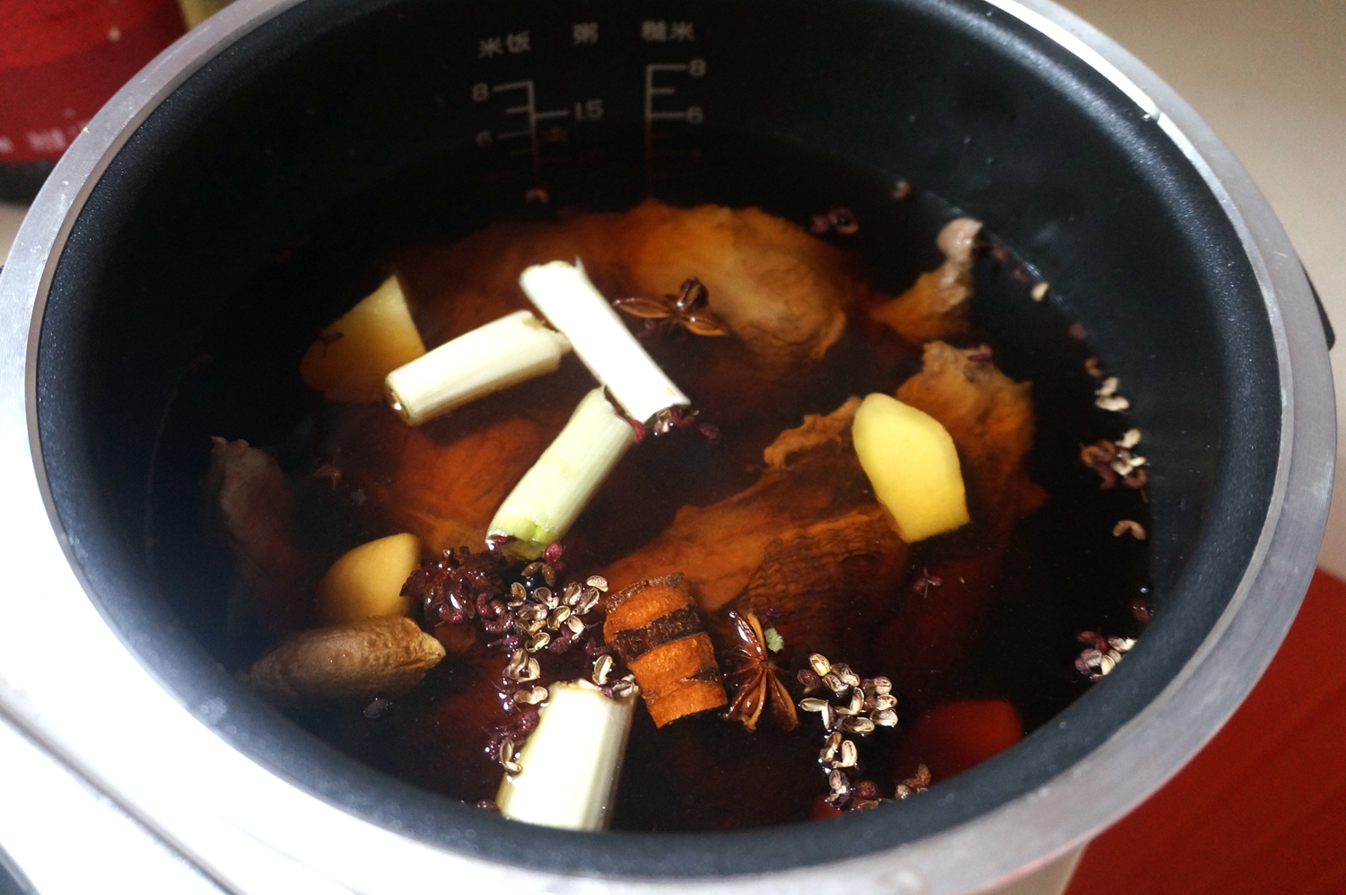 3.加够足量的热水,倒适量酱油、盐,水量以电饭煲最高水位限为准;选择“煲汤”的程序,程序默认90分钟,也可以根据自家喜欢的口感来调整时间;时间到,用筷子扎一扎肉最厚的那块,如果能轻松扎透就可以了。卤好的肉块泡在汤中,直到汤自然冷却再捞出来;这样能将汤中的味道和一些汤汁充分吸进肉中;