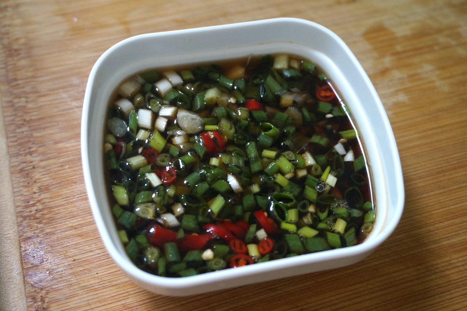 蘸汁材料:香葱、大蒜、小米辣、醋、生抽、(辣椒油酌情加)
