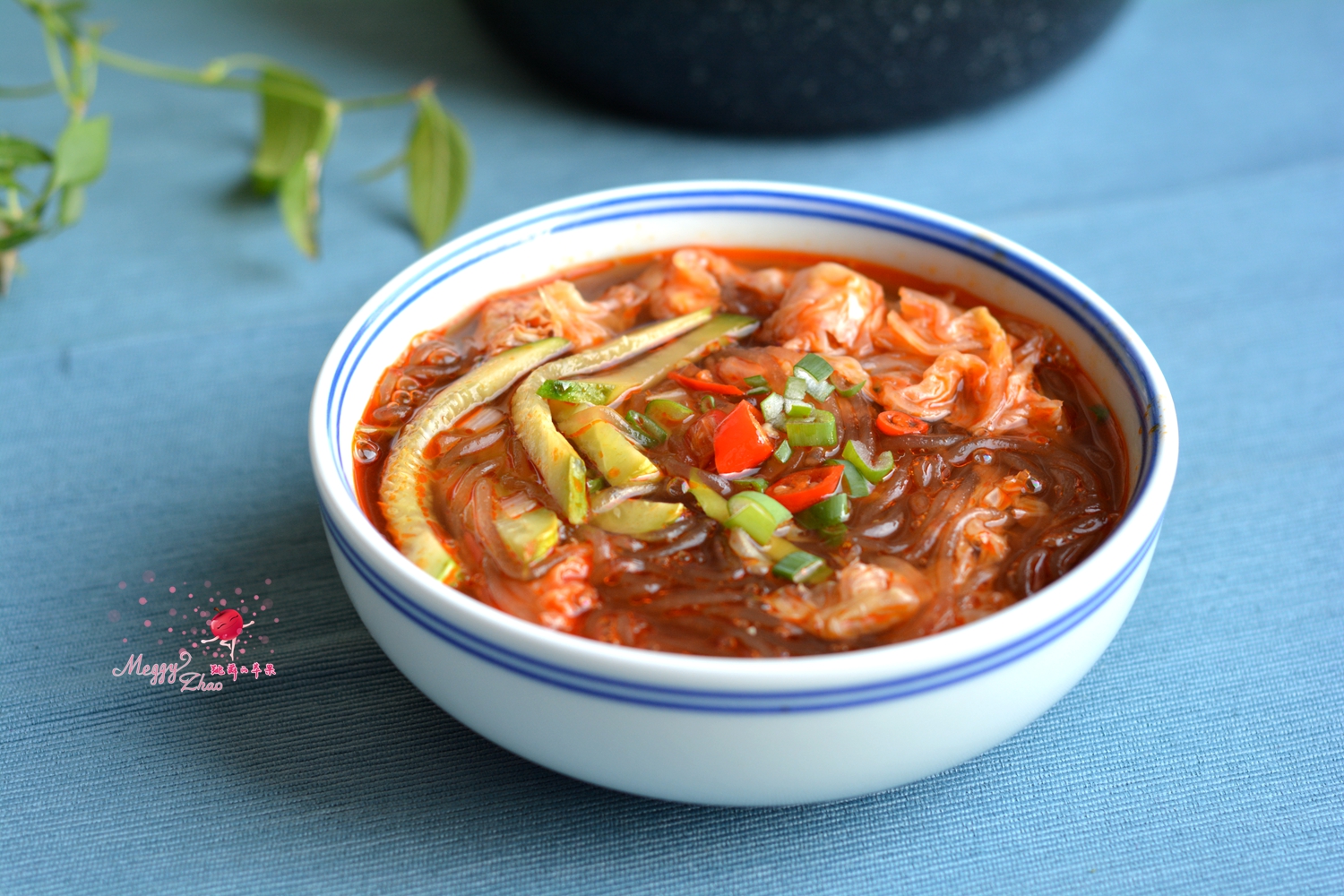 3.水开后,将粉条在锅里煮开,再将白菜叶入锅中煮变软即可;