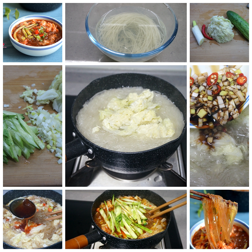 材料:红薯细粉条一大把,白菜叶一适量,小黄瓜一根,小米辣一个,大葱半根,醋适量,生抽适量,盐少许,火锅辣油两大勺
