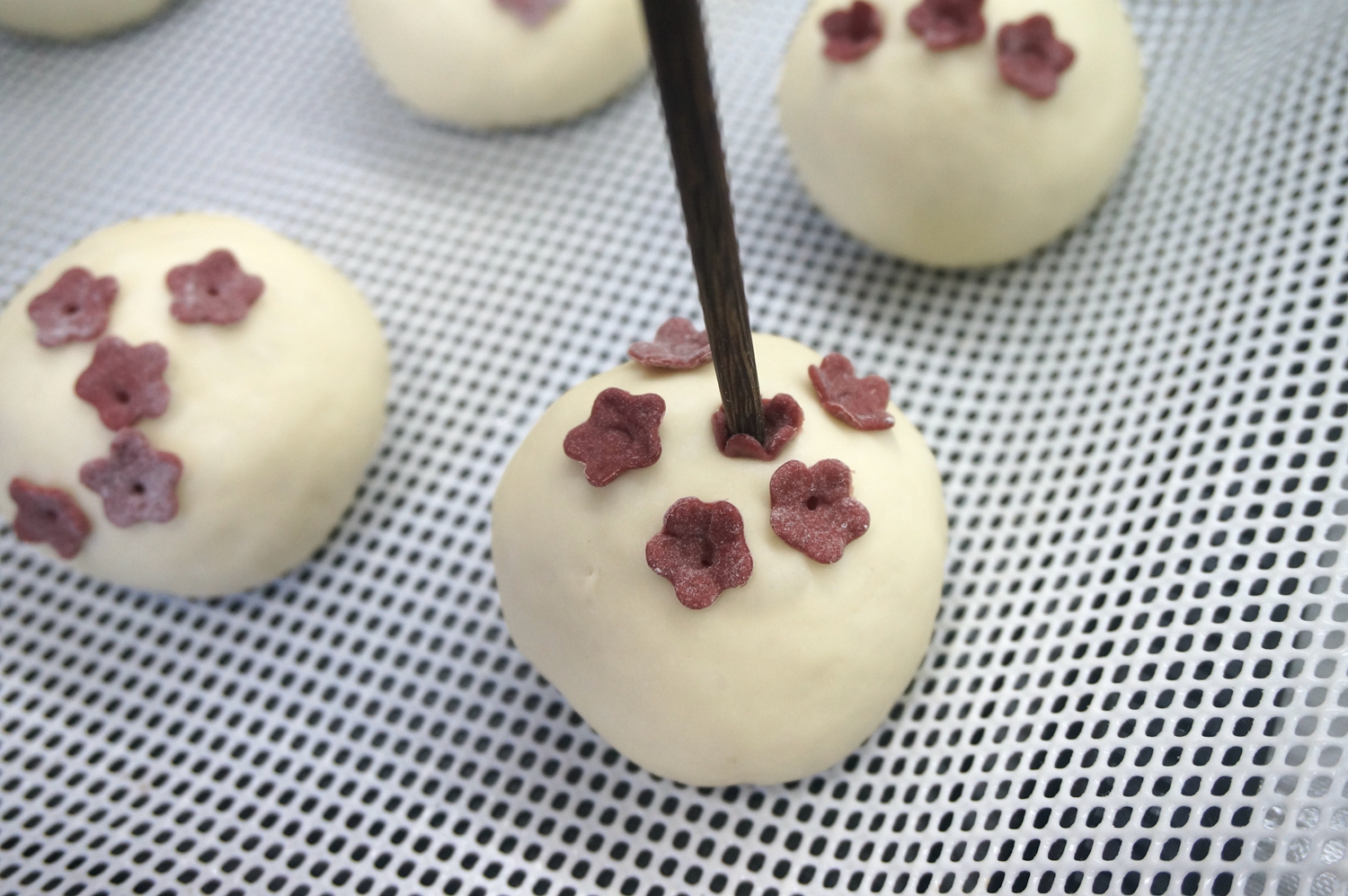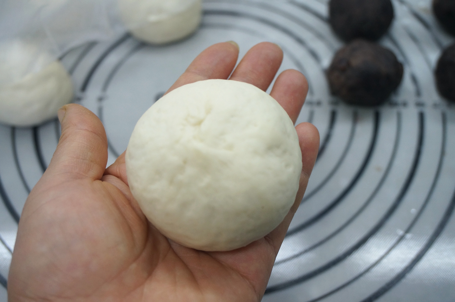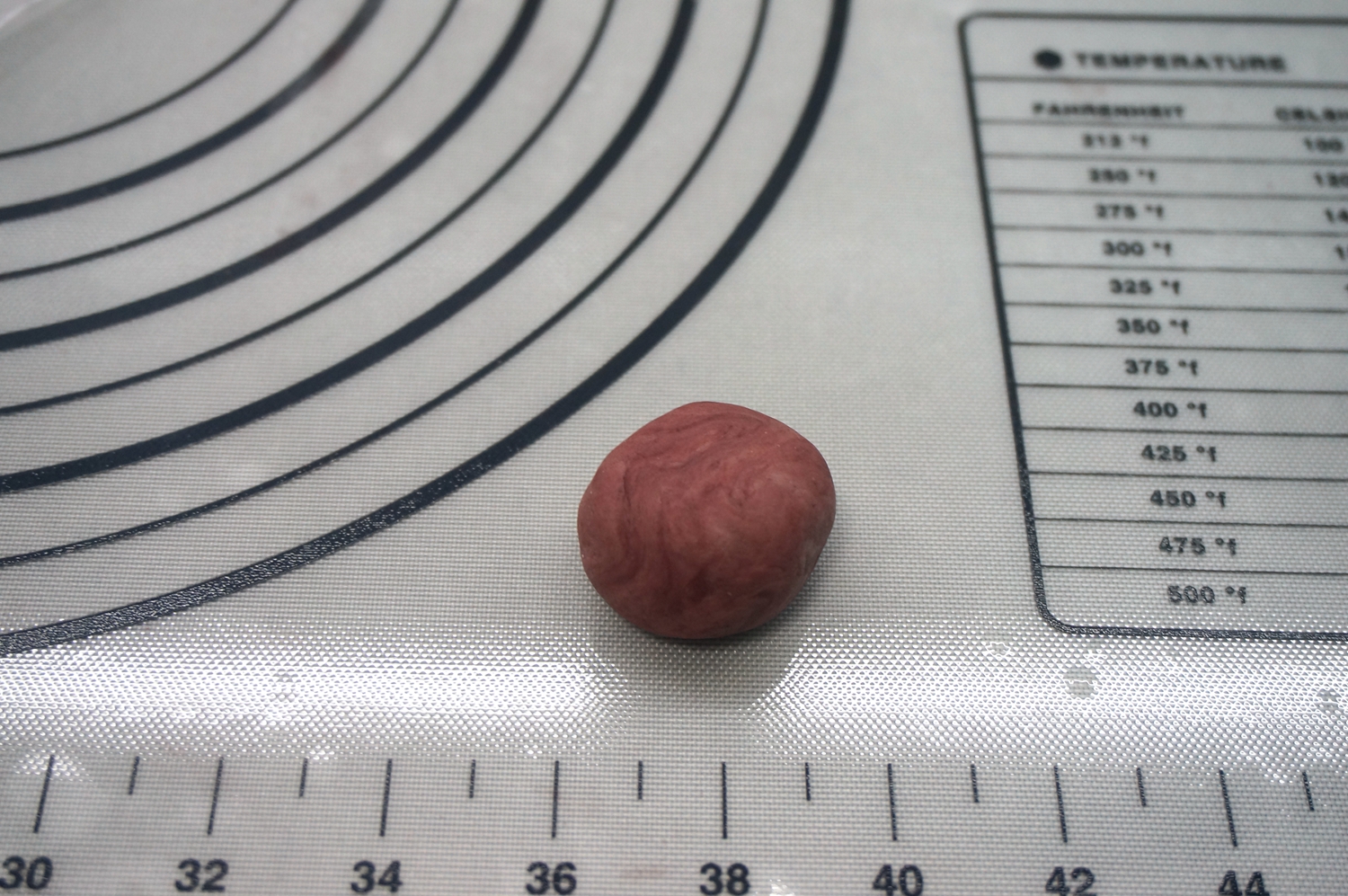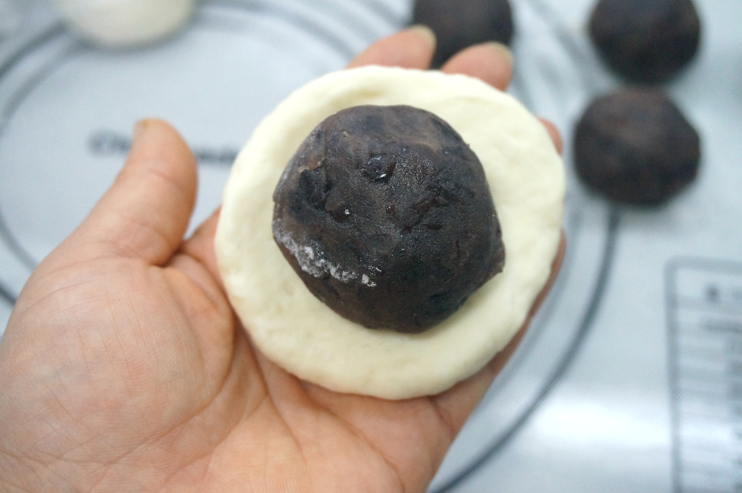 材料:新良蒸制专用小麦粉200克,酵母3克,温水140克,白糖5克,豆馅240克,红曲粉少许