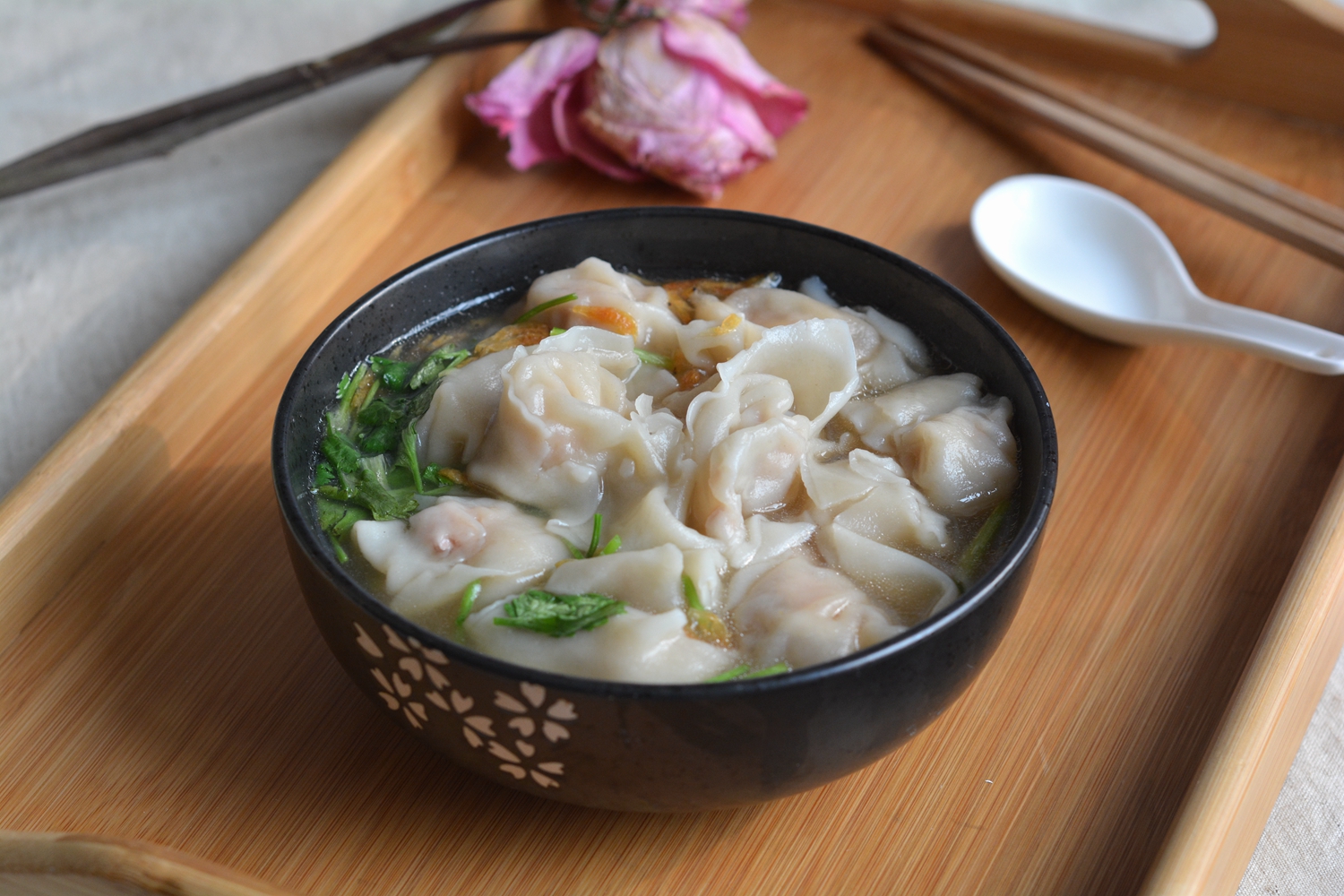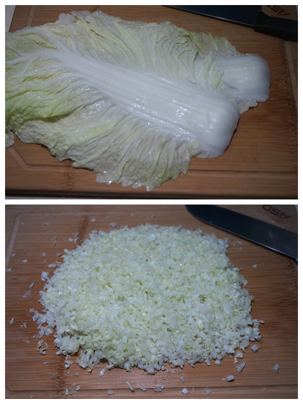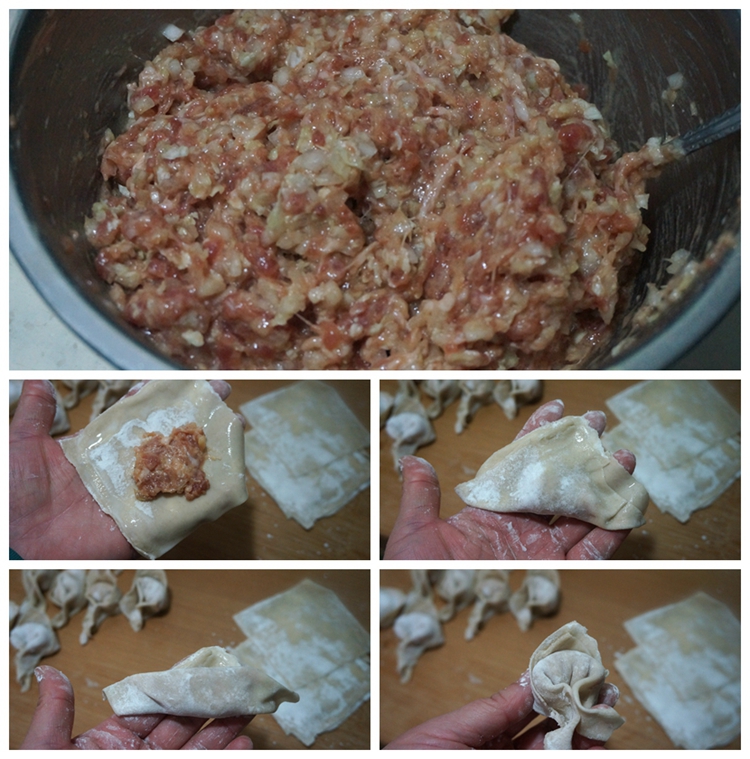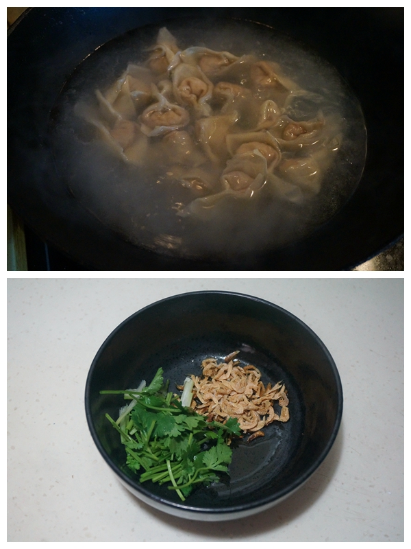 材料:猪肉440克,白菜叶两片,酱油、生抽、盐、面粉、清水、虾皮、香菜、(淀粉、紫菜、醋、辣椒油)