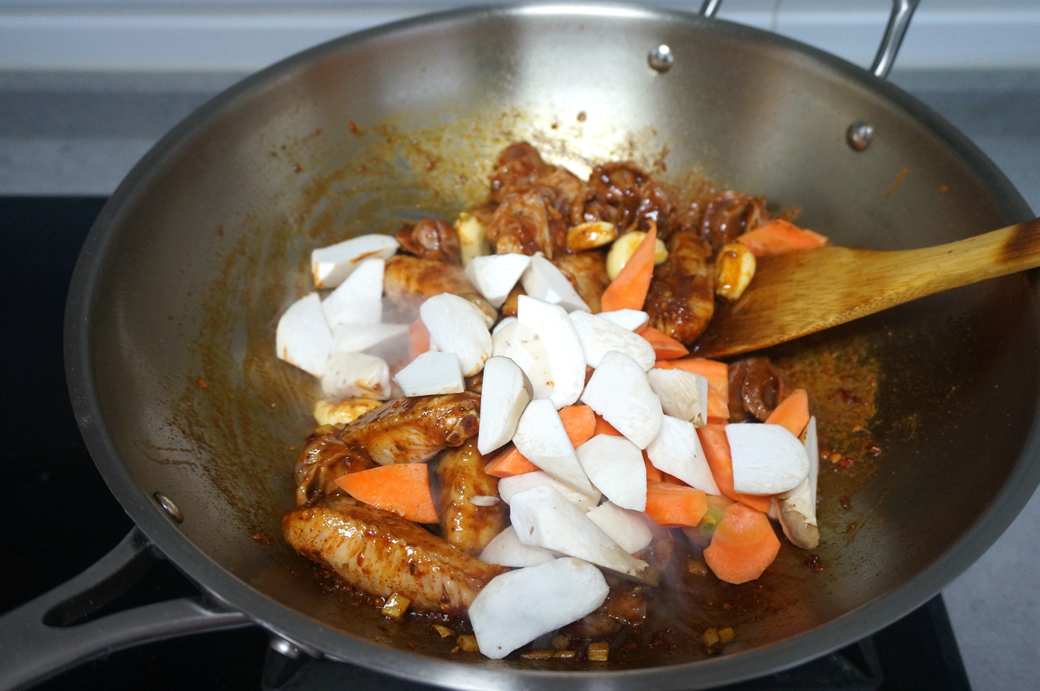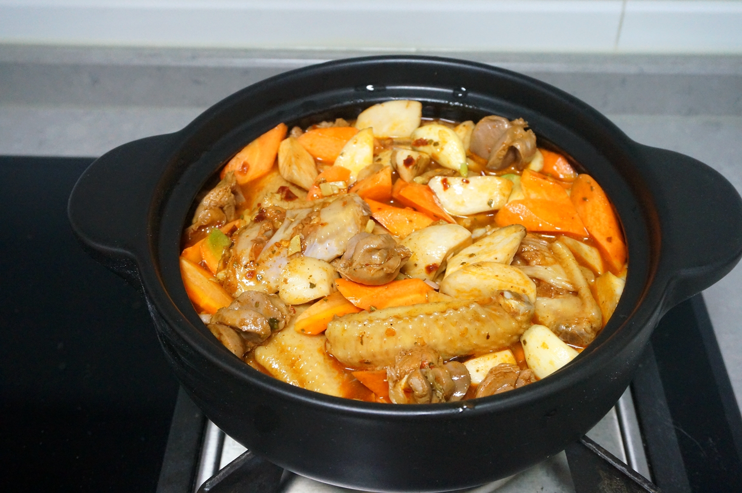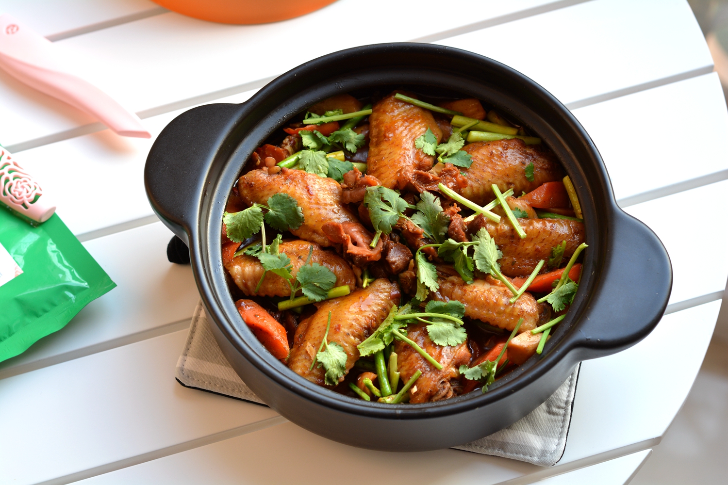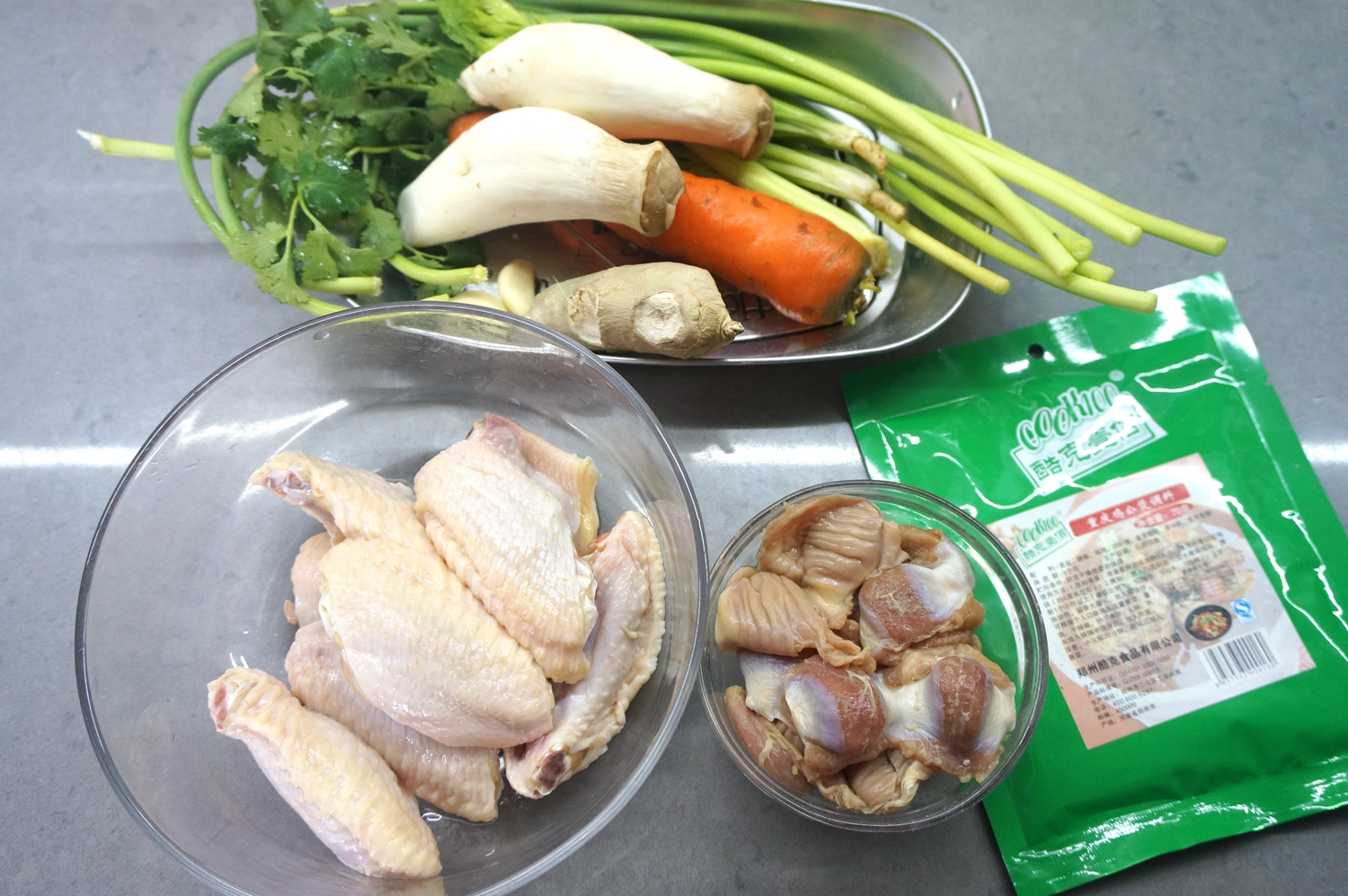 材料:鸡翅中8个,鸡胗1碗,杏鲍菇2根,胡萝卜1根,蒜薹数根,香菜2棵,大蒜1把,姜1块,COOK100重庆鸡公煲调料40克,油少许,酱油少许