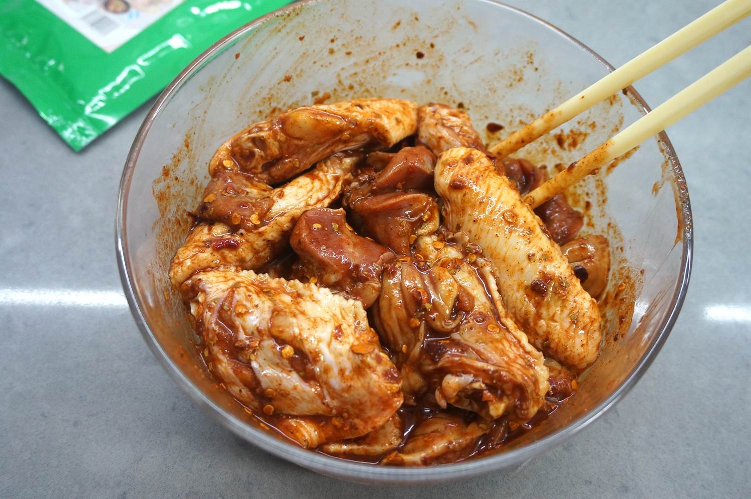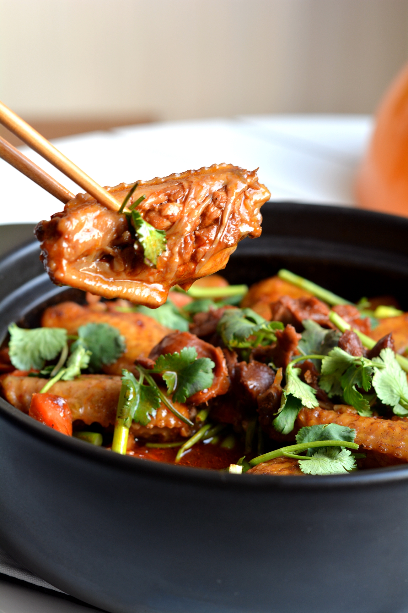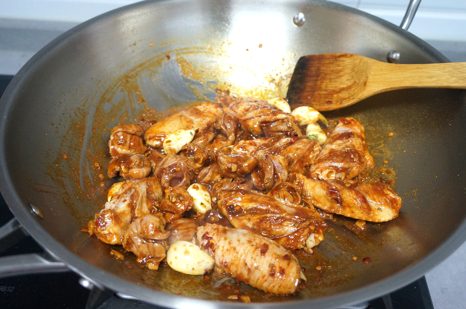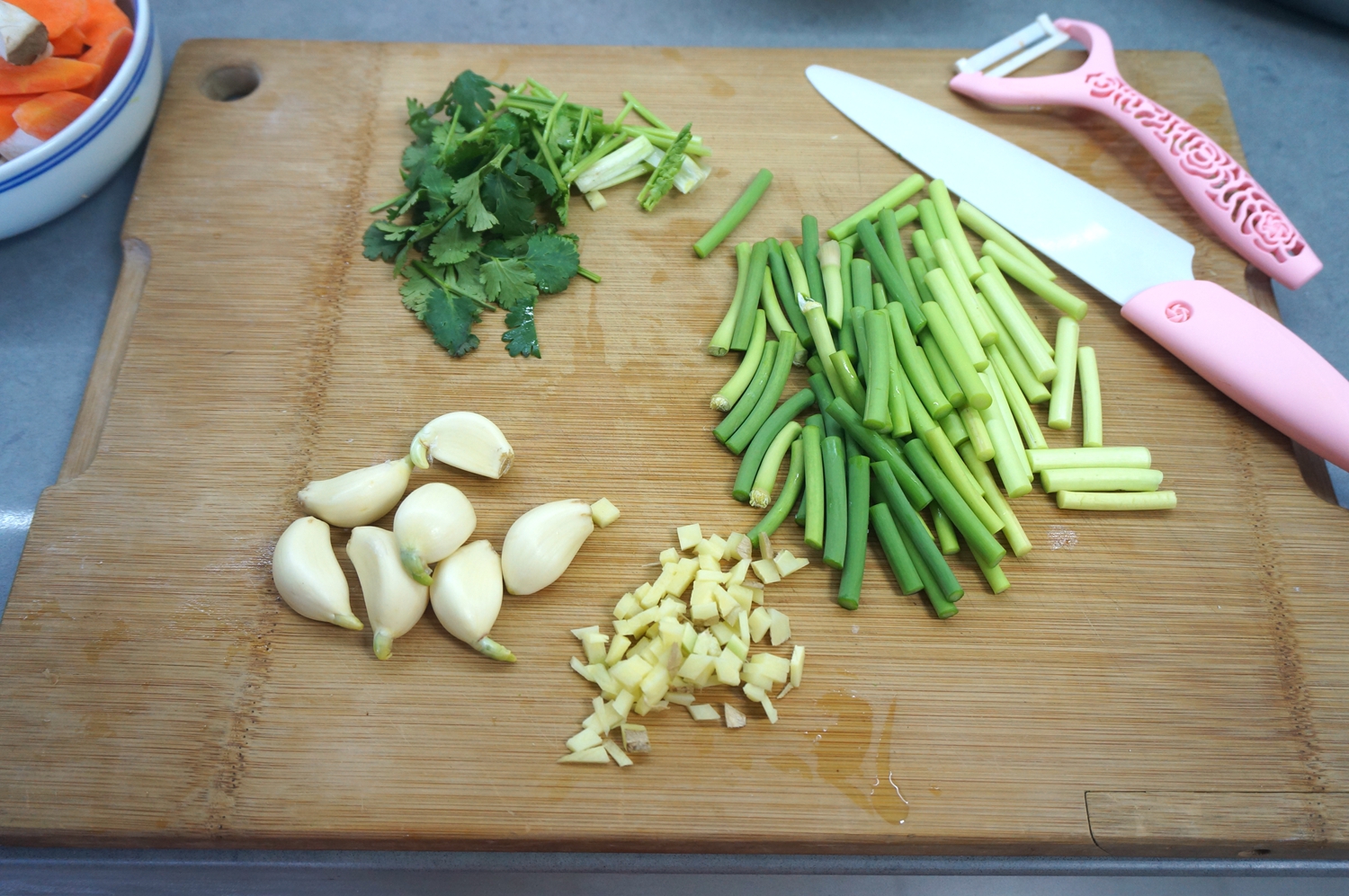 材料:鸡翅中8个,鸡胗1碗,杏鲍菇2根,胡萝卜1根,蒜薹数根,香菜2棵,大蒜1把,姜1块,COOK100重庆鸡公煲调料40克,油少许,酱油少许
