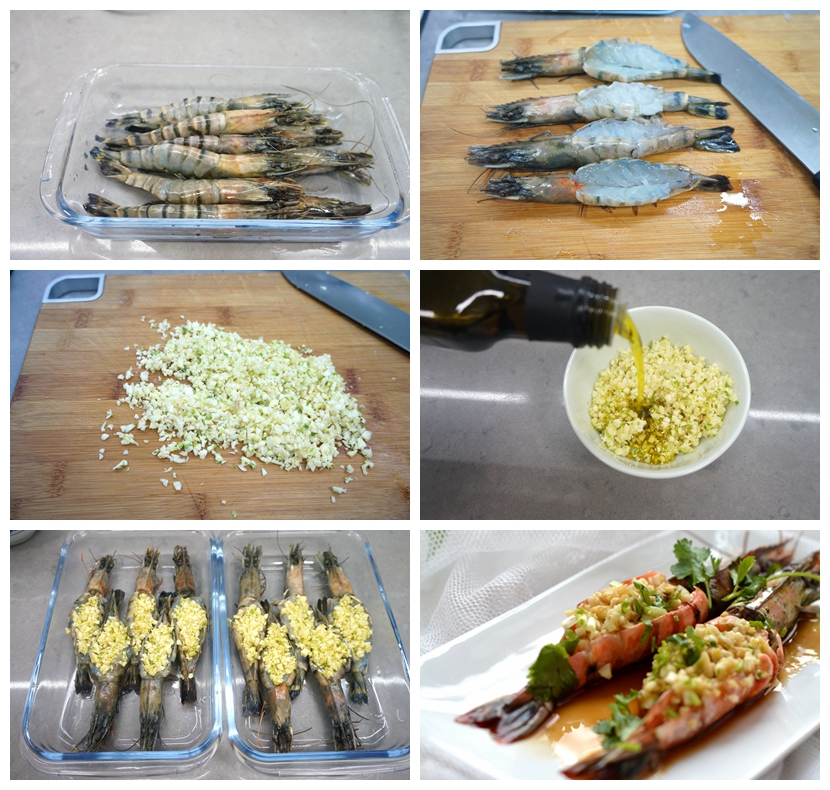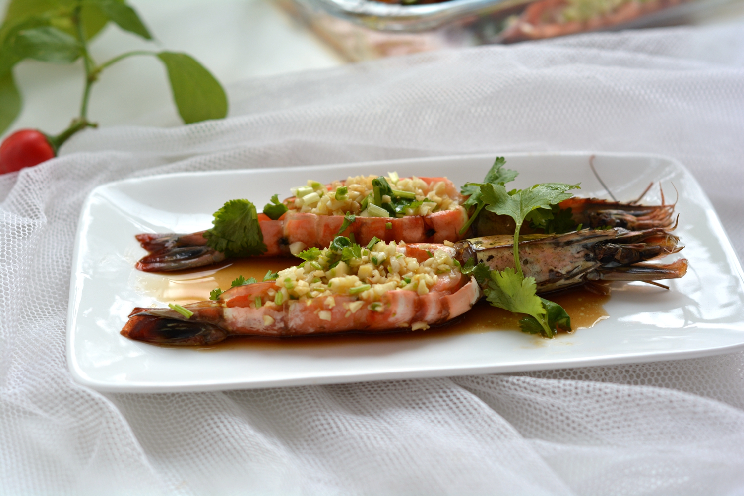 材料:对虾10只,大蒜2头,橄榄油适量,蒸鱼豉油适量