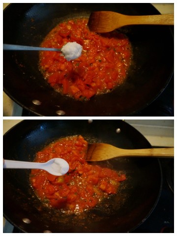 8. 待西红柿块炒出些许汤时,加入一小勺白糖,既可以提鲜,又可以中和一下西红柿的酸;