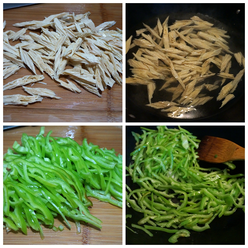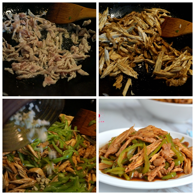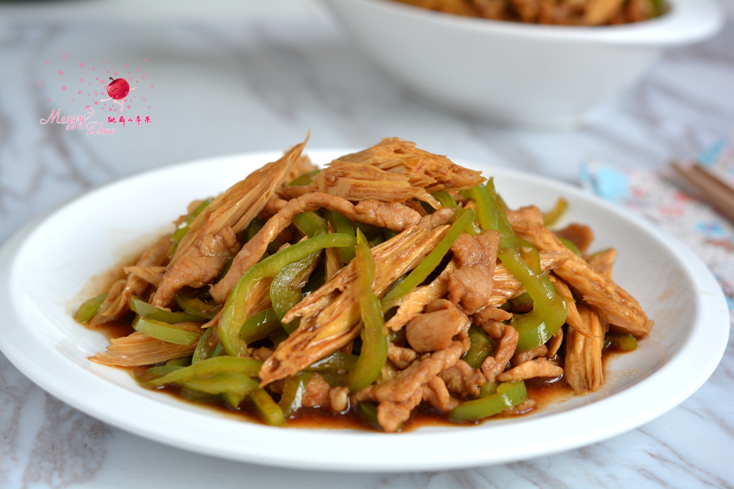 材料:猪肉150克,腐竹适量,尖椒2根,植物油适量,料酒少许,淀粉一小勺,盐适量,酱油适量,大蒜3瓣