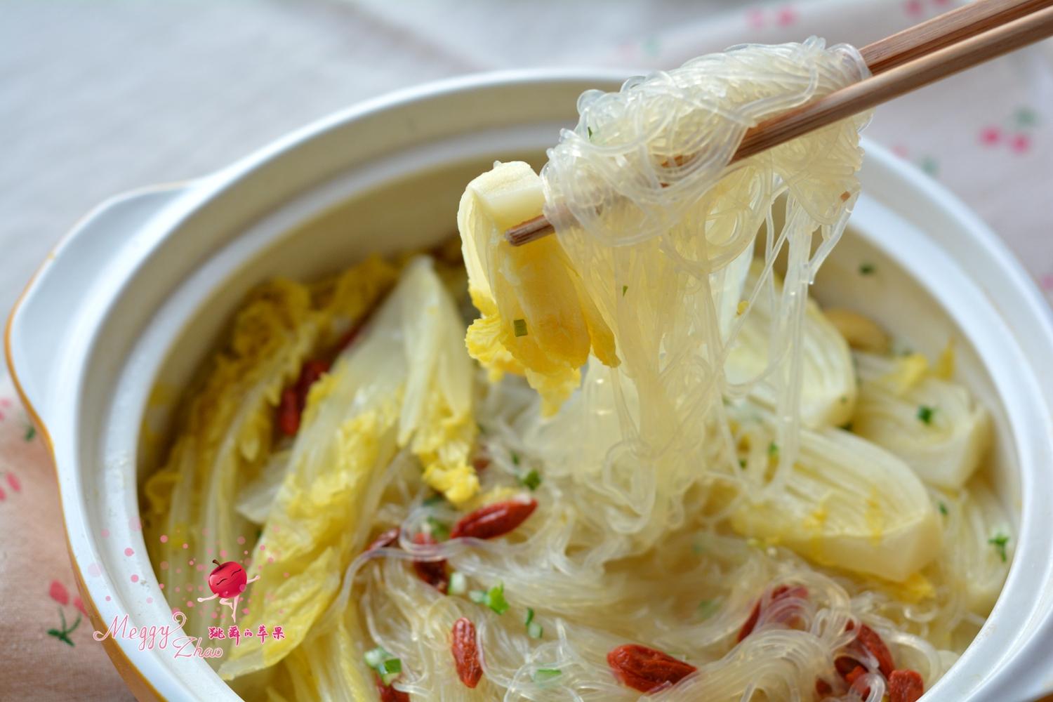 材料:娃娃菜两颗,龙口粉丝两小把,枸杞一撮,鸡汤适量,盐适量