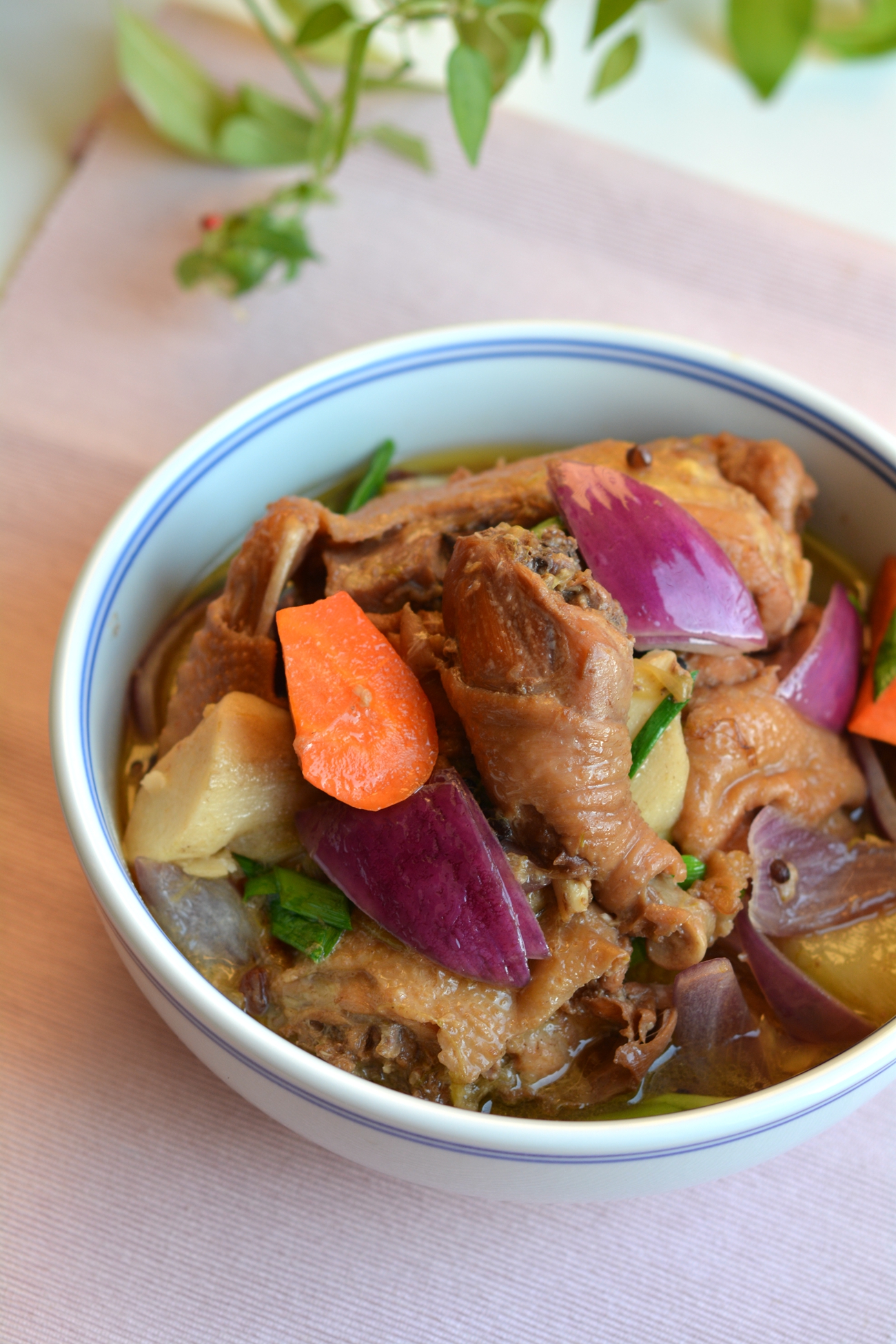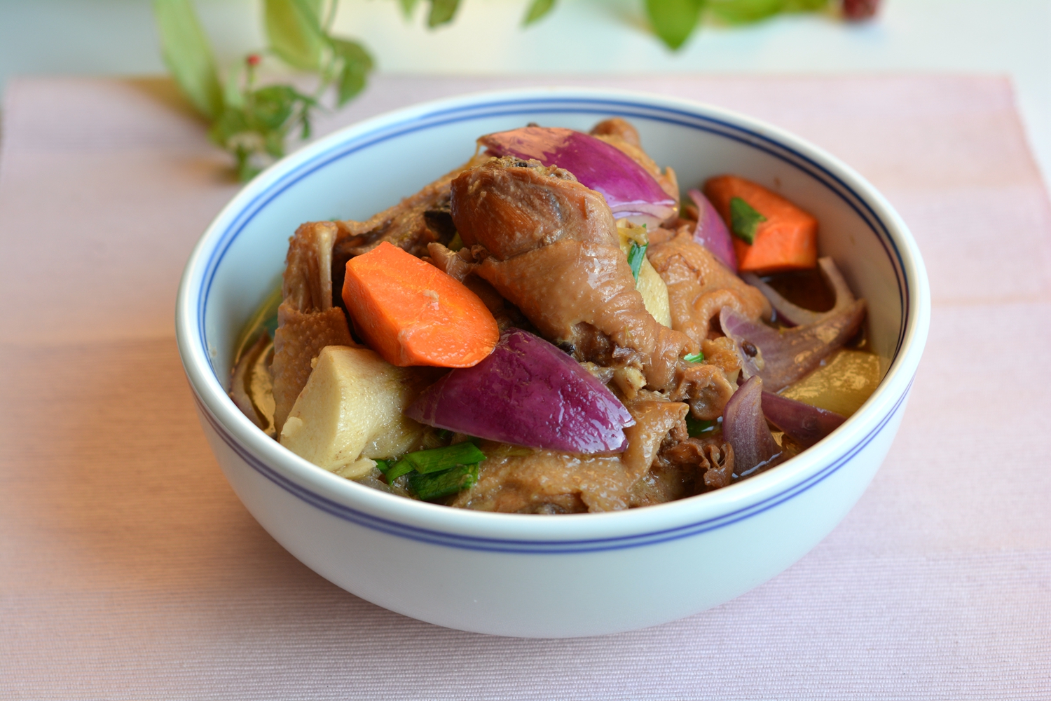 材料:老母鸡1只,土豆1个,小芋头4个,胡萝卜1根,洋葱1个,大葱半根,大蒜1把,姜1块,花椒1撮,八角3颗,香叶2片,油少许,酱油适量,盐适量