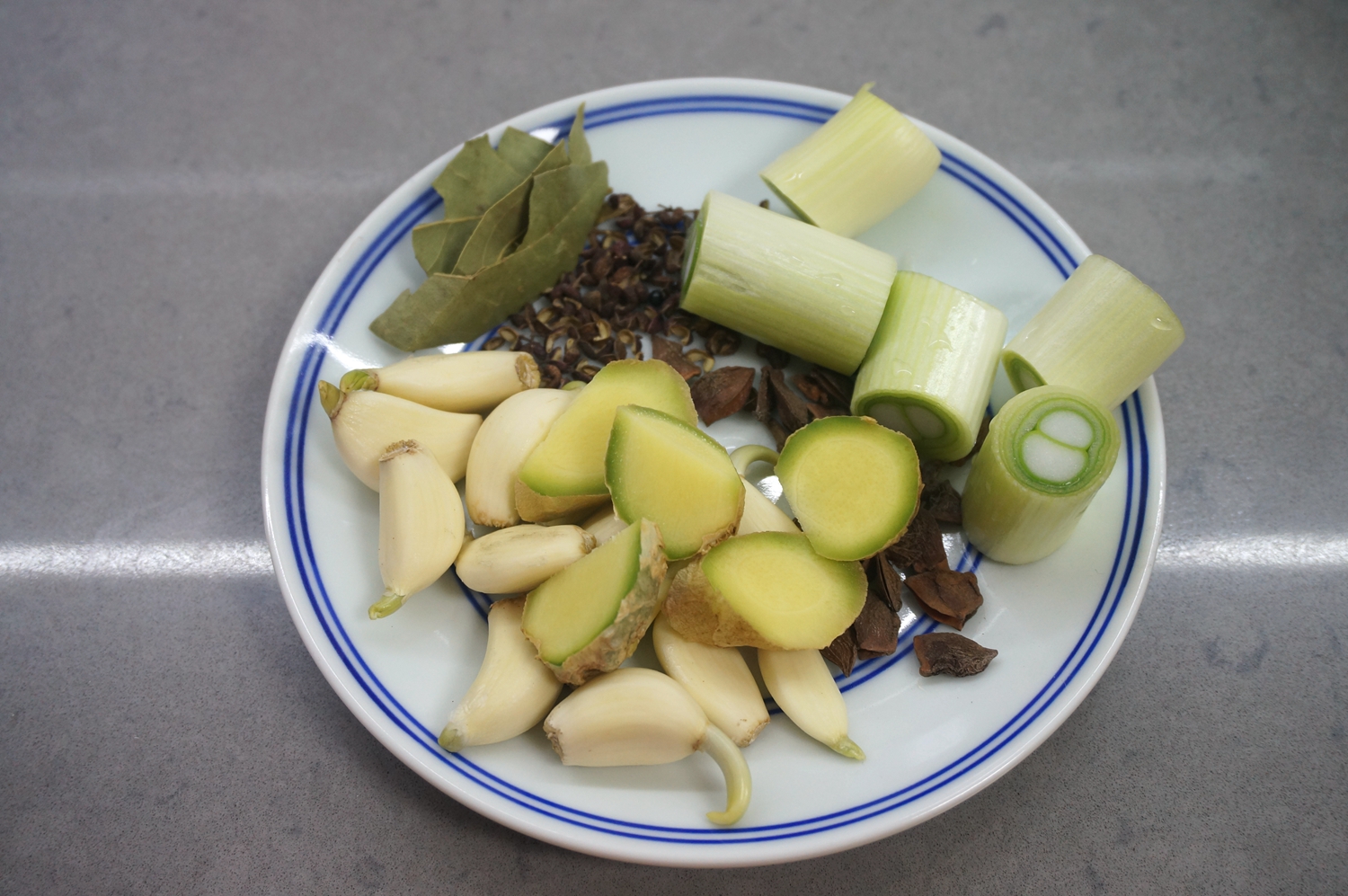 3.准备好香料:大葱、姜、大蒜、八角、花椒、香叶,几味常见的就足够了,喜欢吃辣的再来几个干辣椒;
