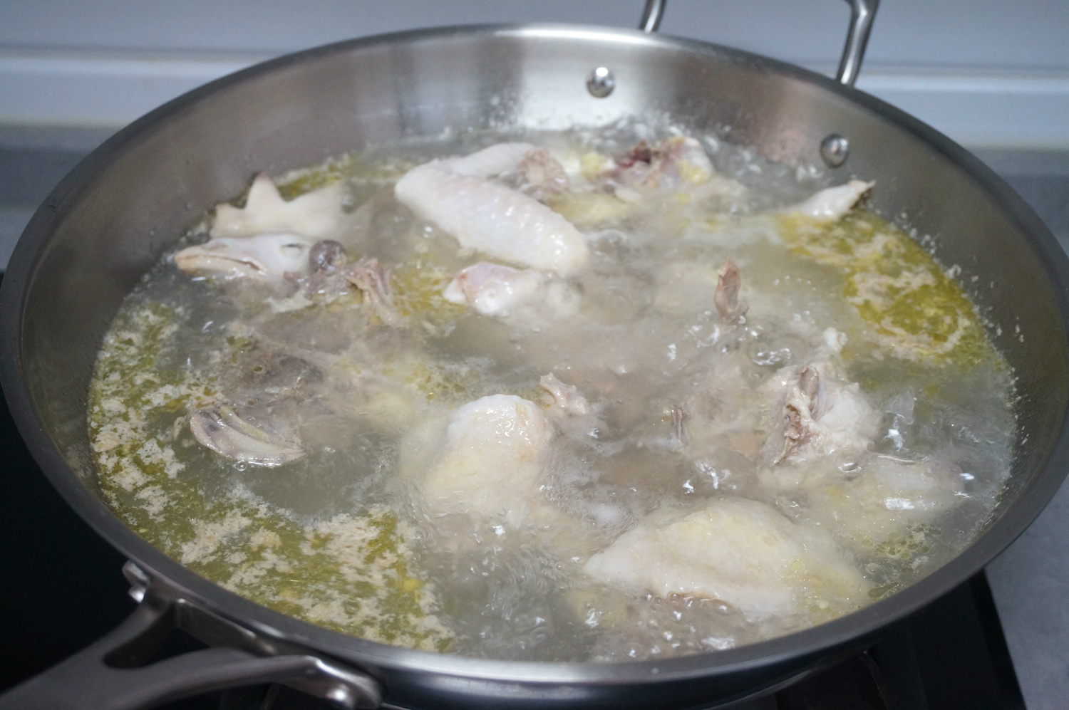 4.将鸡块入温水锅中煮开,去除杂质,用筷子将鸡块从沸腾的地方夹出来,避免浮沫沾在上面;