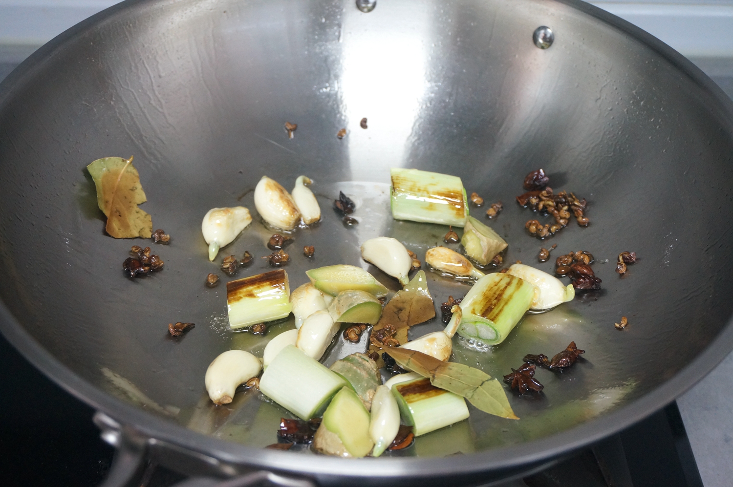 5.另起一锅,倒少许油,不要等油热,温热时将香料倒锅中,小火翻炒出香味;