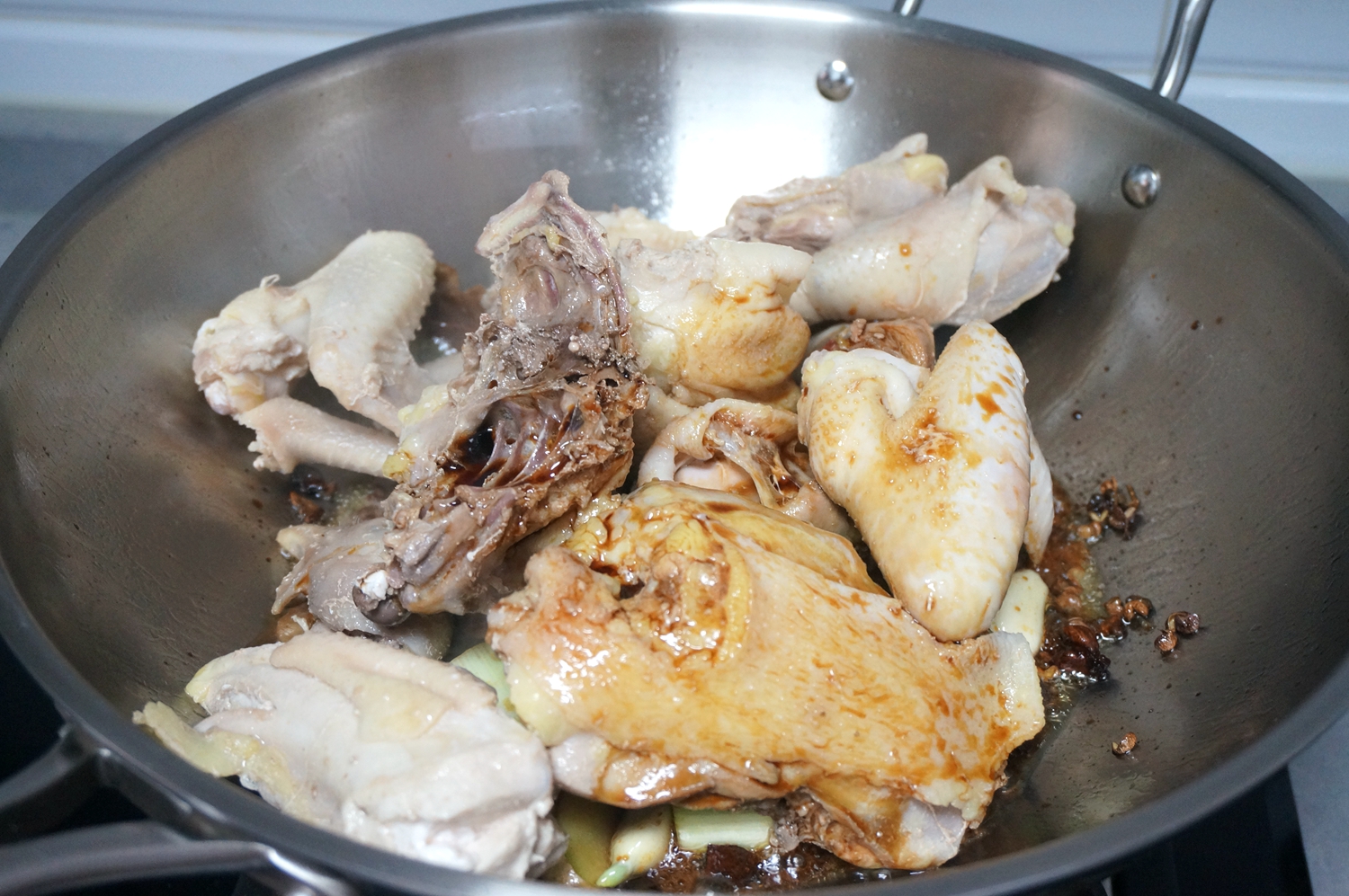6.将鸡块倒入锅中翻炒片刻,淋入适量的酱油,翻炒上色;
