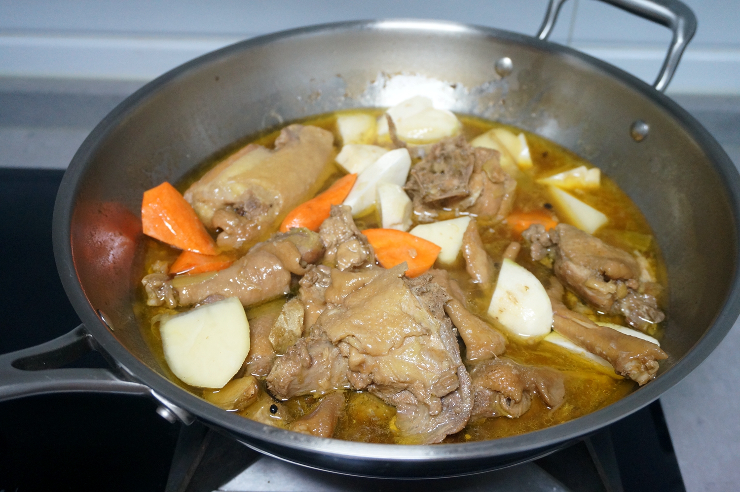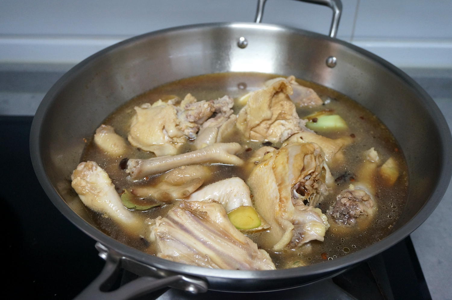 7.再倒入没过鸡块的热水,一定要用热水,这样能将鸡肉的鲜香味慢慢渗透出来,如果用凉水,肉就紧了发柴不好吃;盖上盖子,小火慢慢炖着,中途水不够还要加热水;
