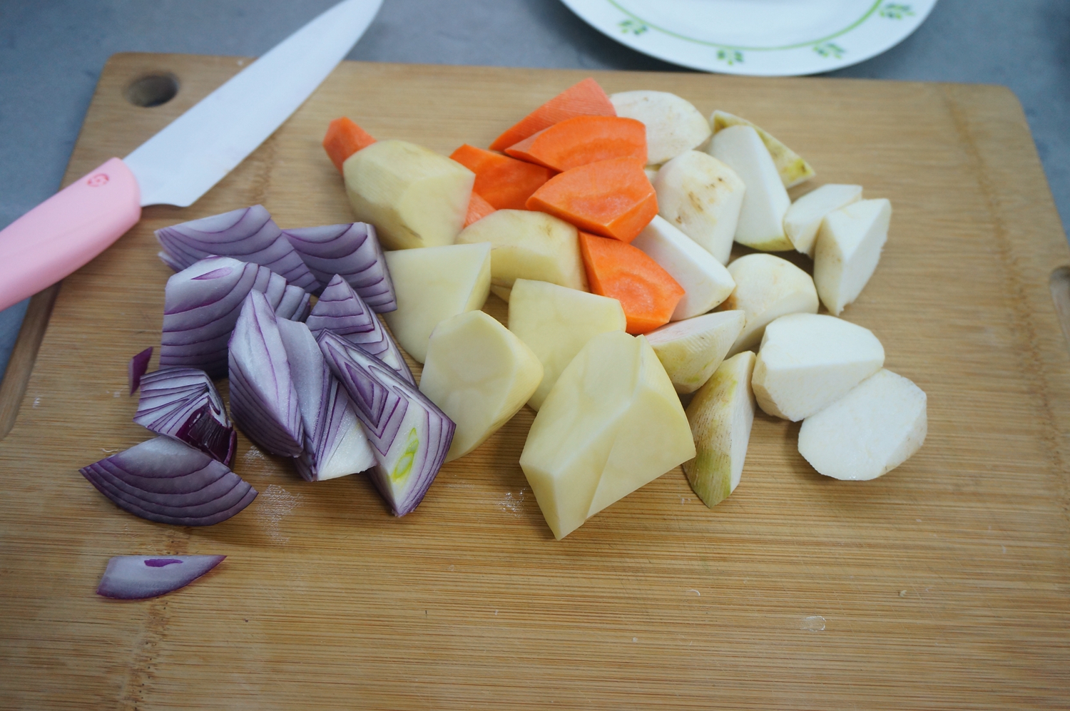 8.尝尝肉能咬动并且差不多能脱骨了,将土豆、芋头、胡萝卜、洋葱切滚刀块;