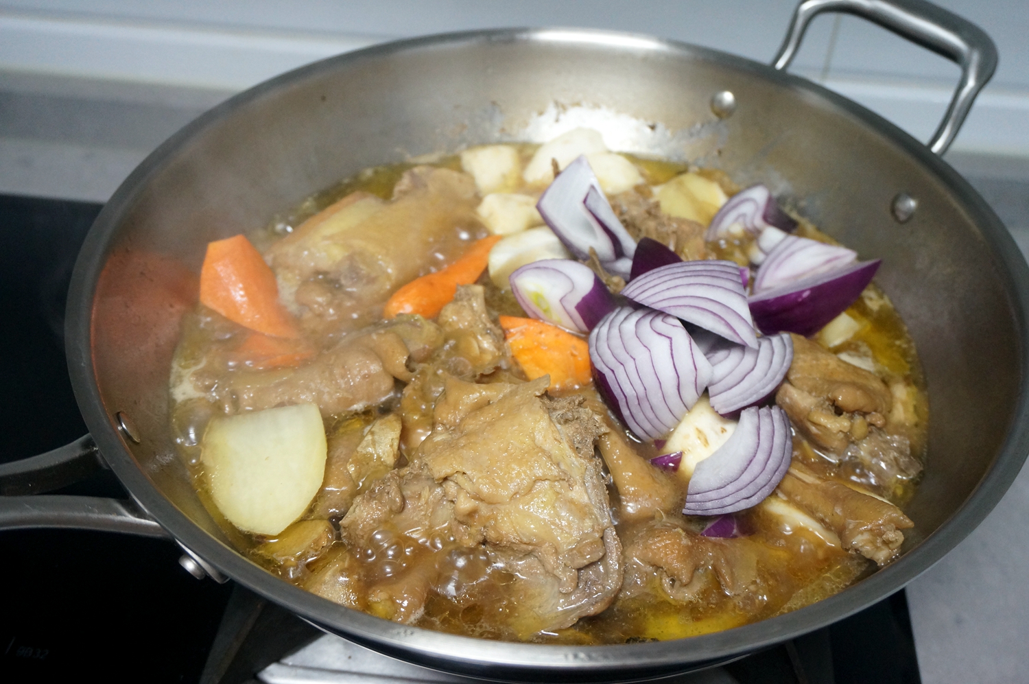 10.起锅前将洋葱块入锅中,翻几下,油润变色即可关水,余温能将洋葱焖熟而且颜色还鲜亮。