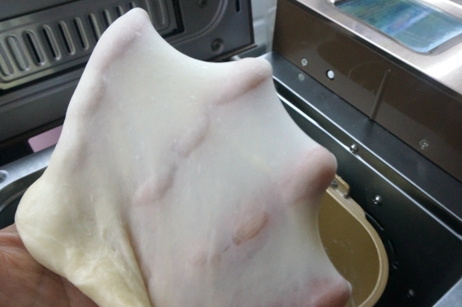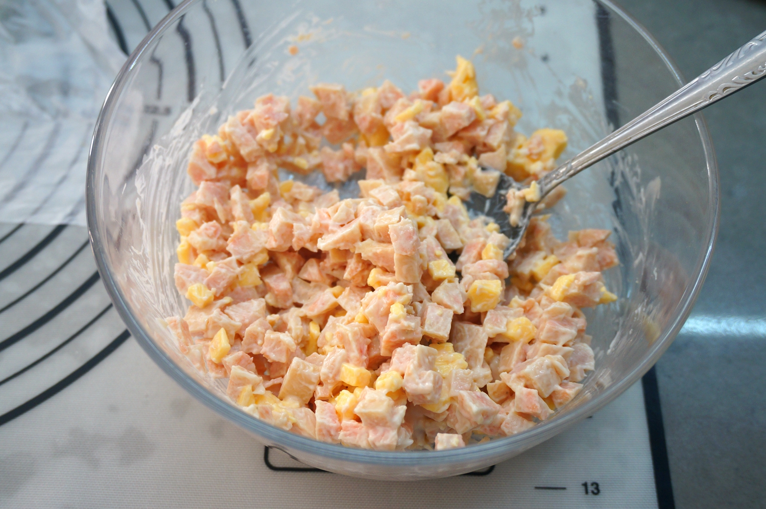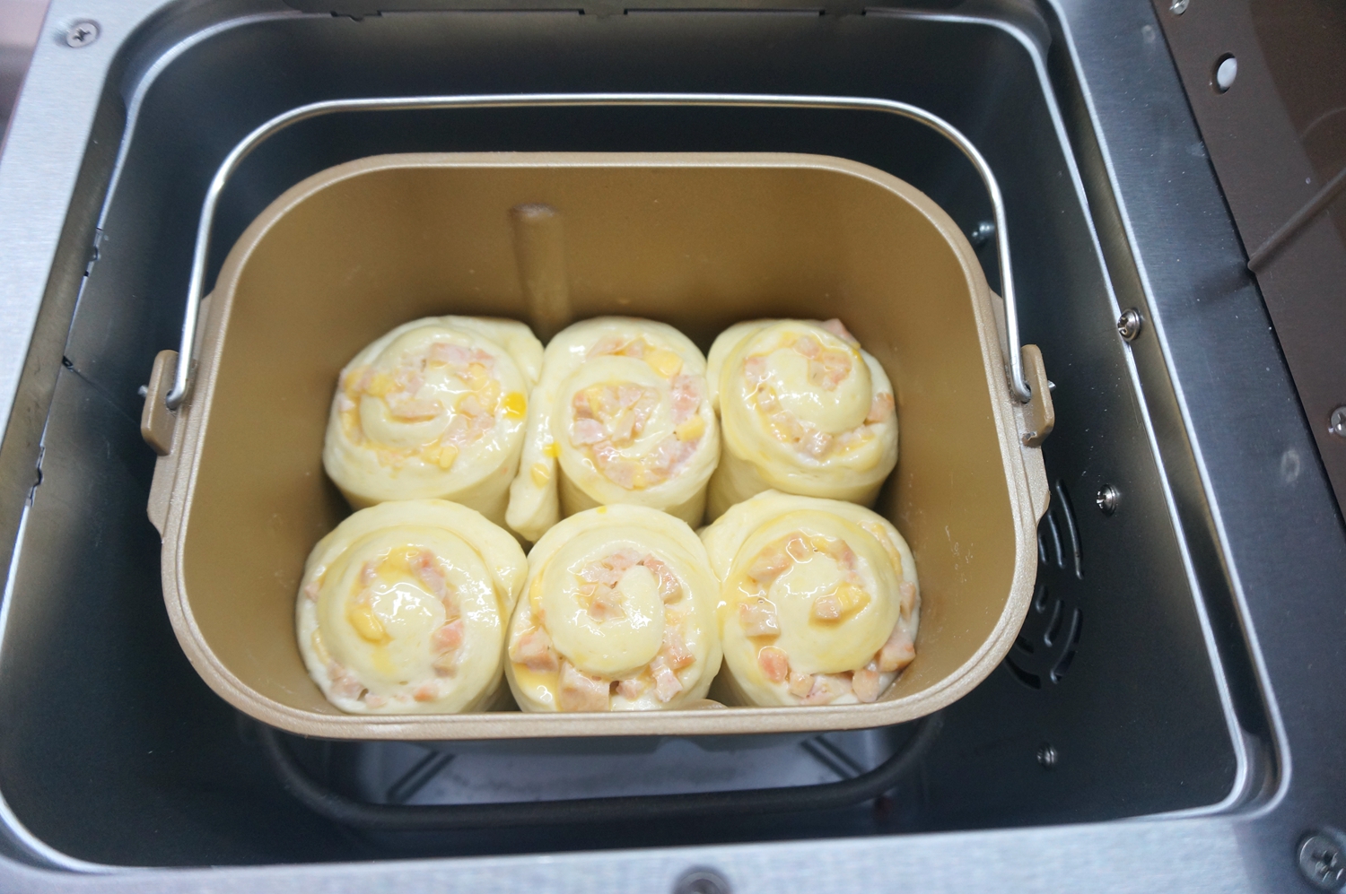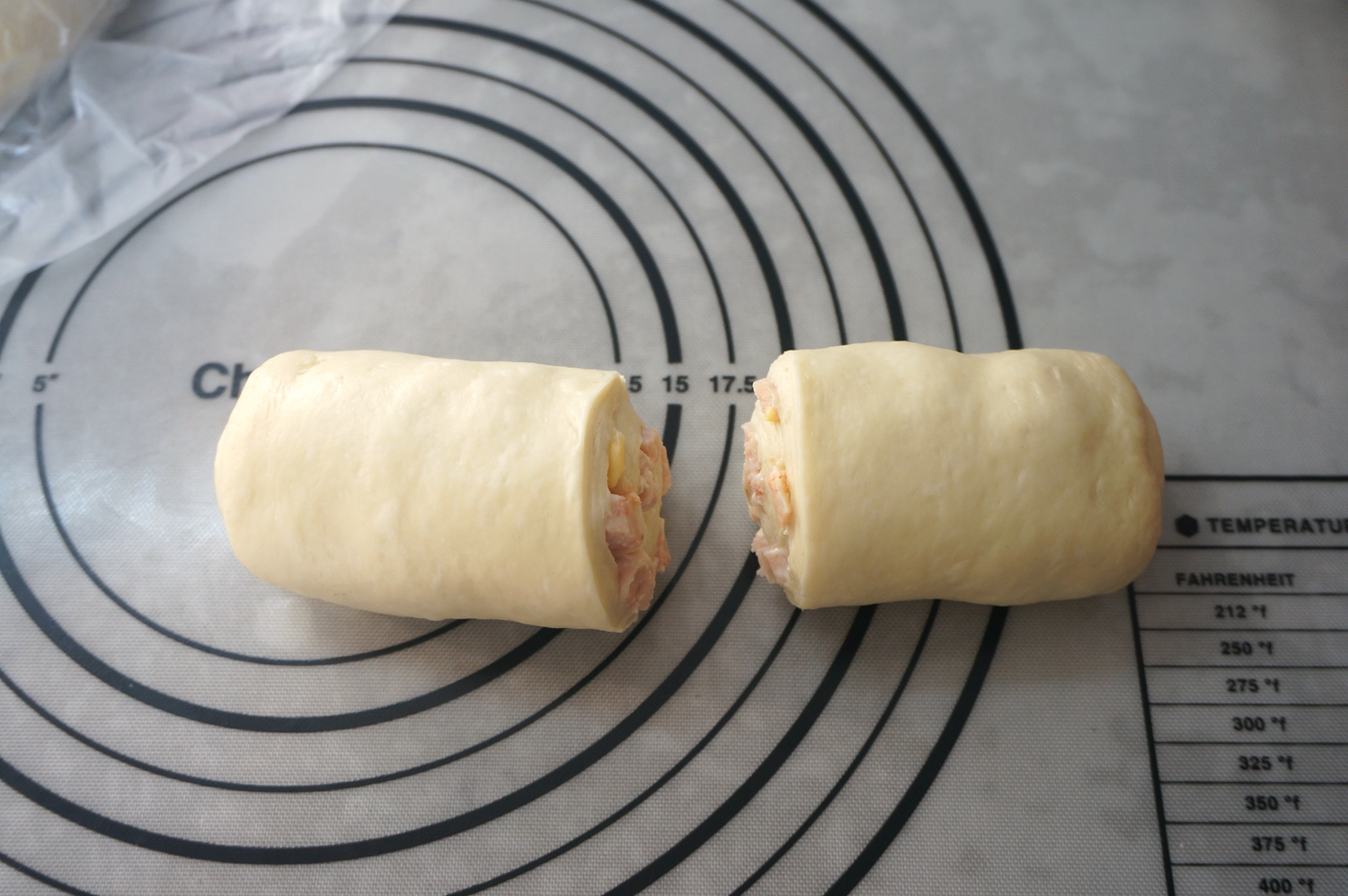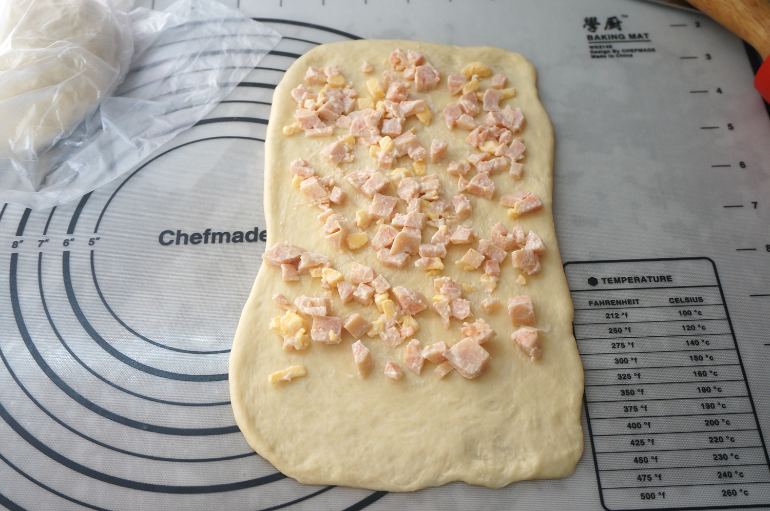 果不其然,切成丁再加点奶酪片、沙拉酱,混合均匀裹在面片里,做好的面包口感略湿润,但是带着大海的味道确实很好吃。本来是明天早上的早餐的,我先忍不住吃了一条。嗯,晚饭可以少吃点了。