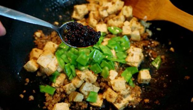 材料:北豆腐400克,荷兰豆适量,玉米油30克,猪肉馅100克,酱油少许、盐适量,风味豆豉酱两勺,香葱少许,蒜末少许