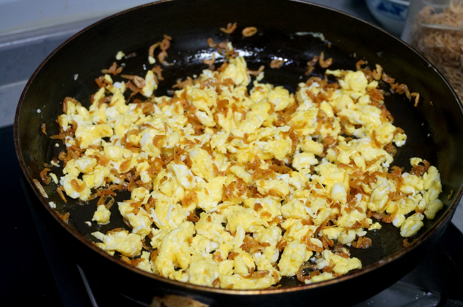 2. 炒锅中倒油,比平时炒菜油多一些,鸡蛋液入锅中炒成小块,再加虾皮同炒,晾凉后使用;http://si1.go2yd.com/get-image/0JZAKmbQ7pA