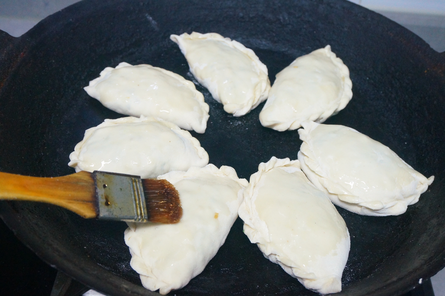 9. 将合子依次包好,放入平底煎锅中,我用的是老式铸铁锅,底子厚,温度均匀,锅里不用放油,中火加热后转小火,用刷子在合子表面刷一层油;http://si1.go2yd.com/get-image/0JZAjVH57UO