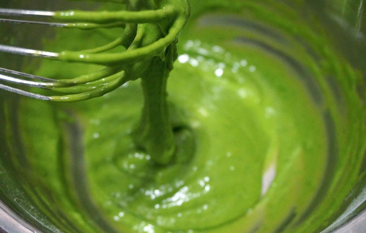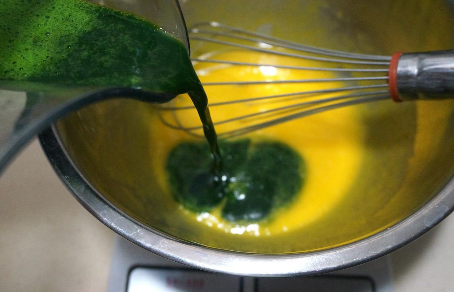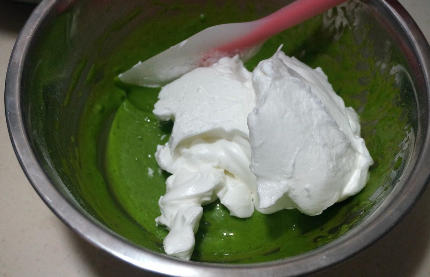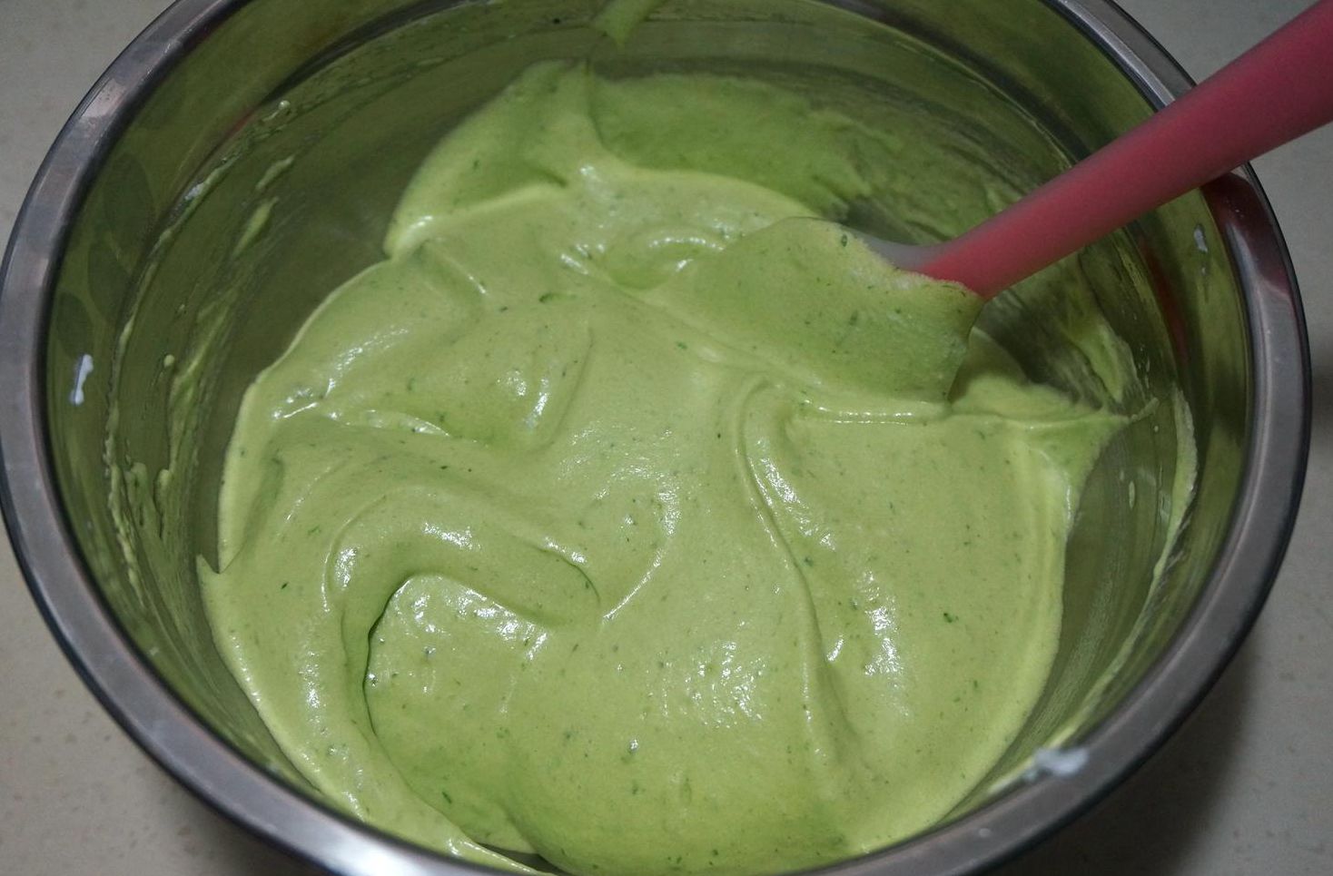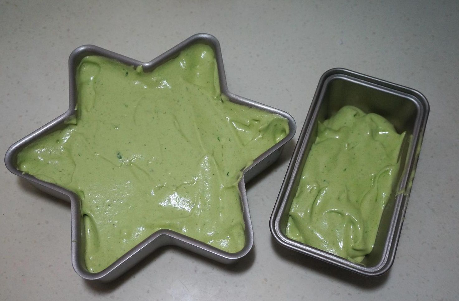 3. 同样,菠菜汁可以用橙汁来代替,再擦点橙皮屑,就是橙味蛋糕了;