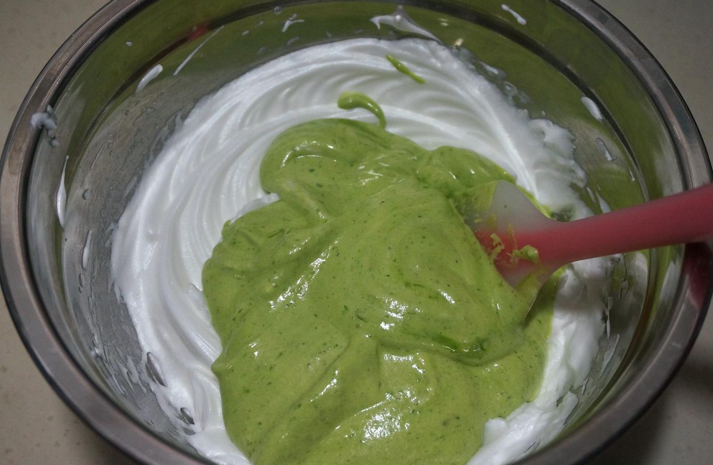 材料:鸡蛋3个,低筋面粉(蛋糕粉)60克,蛋黄用白糖15克,蛋白用白糖45克,玉米油40克,菠菜汁45克烘烤:120度,80分钟;如果温度在140度,可以在50-60分钟左右http://si1.go2yd.com/get-image/0JaMCZipeQC