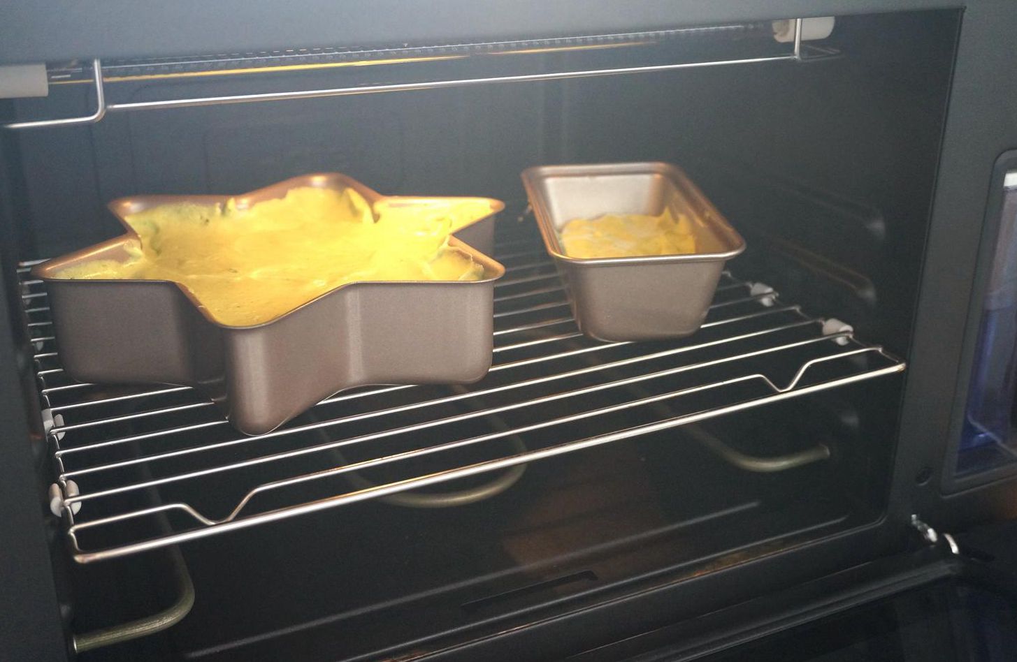 2. 用低温烤的这个蛋糕,因为这个模具是不粘的,如果温度高,蛋糕涨发快,出炉就缩腰,因此低温更合适;如果你用的模具不是不粘的,可以将温度调到140度-150度之间,时间在50-60分钟左右,主要还是要看蛋糕的状态;