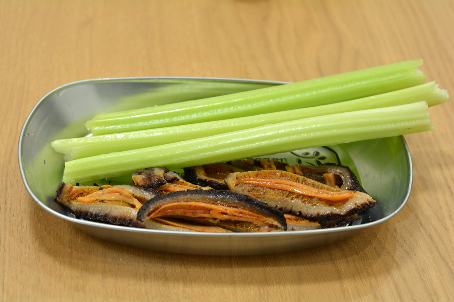 材料:红极参5条,芹菜杆3根,油少许,姜少许,盐适量