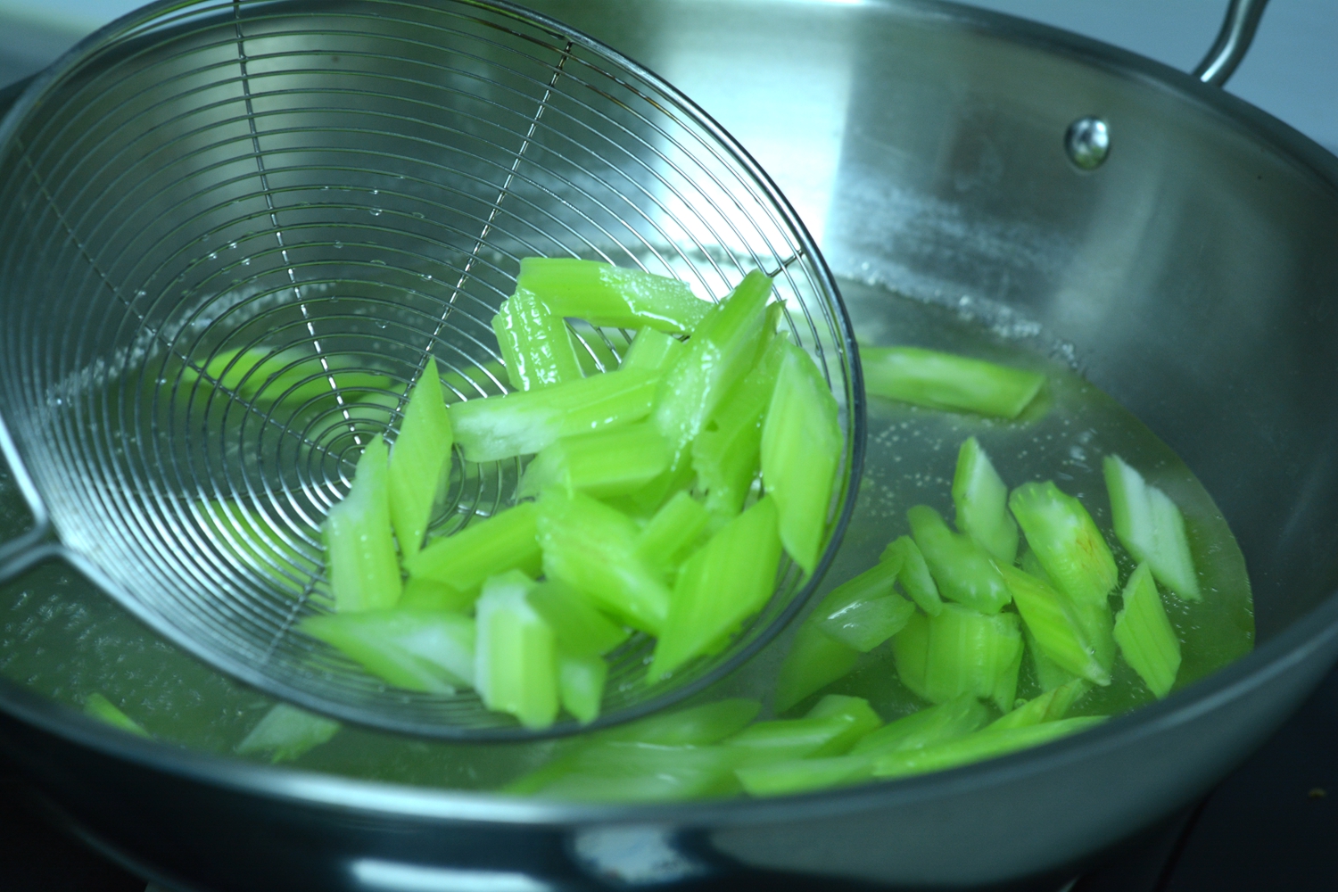 3. 入开水锅中焯一下,再用凉水冲一遍,保持脆绿状态;http://si1.go2yd.com/get-image/0JdYWoS8sVc